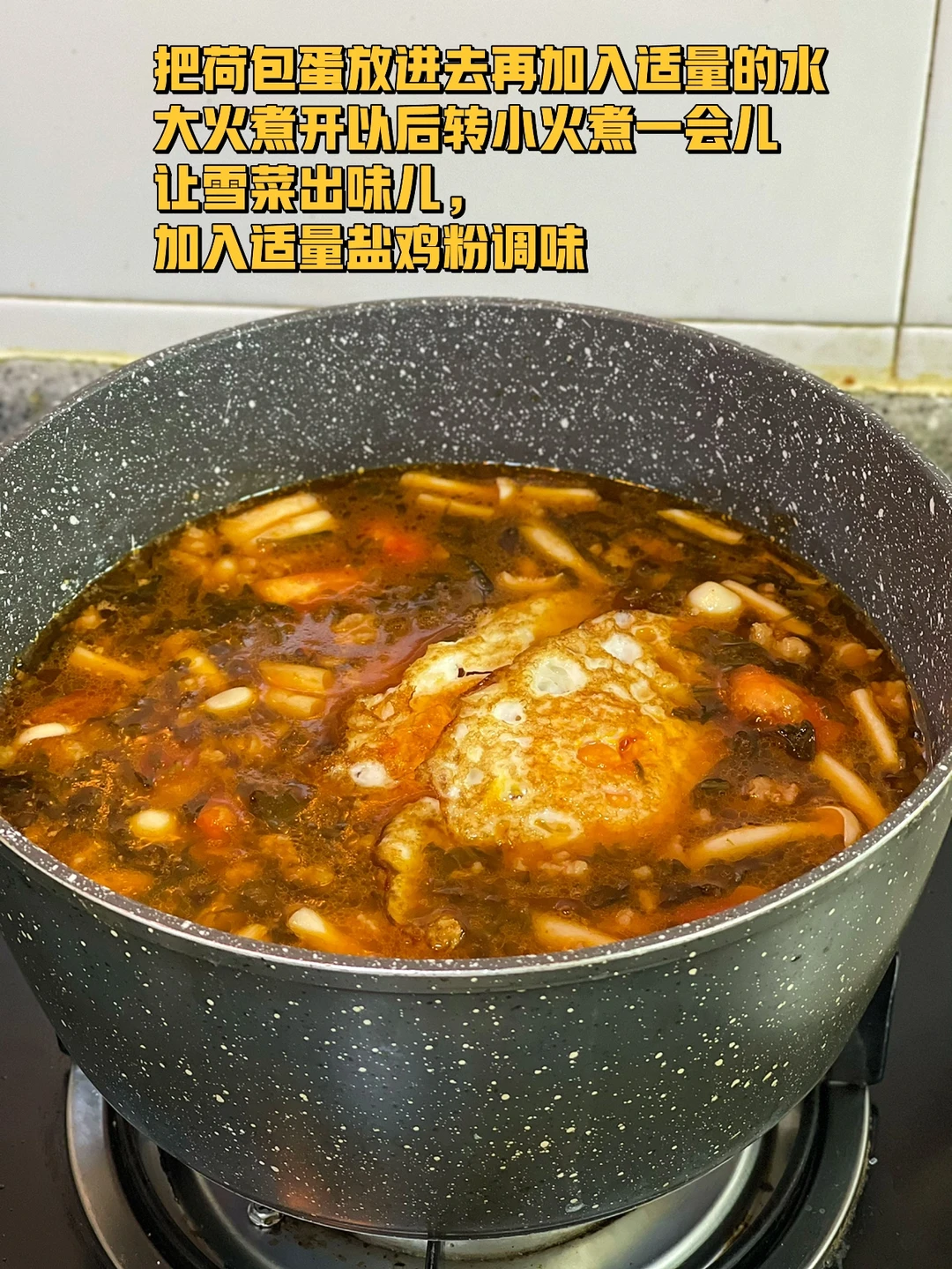 9. 把荷包蛋放进去再加入适量的水大火煮开以后转小火煮一会儿让雪菜出味儿,加入适量盐鸡粉调味