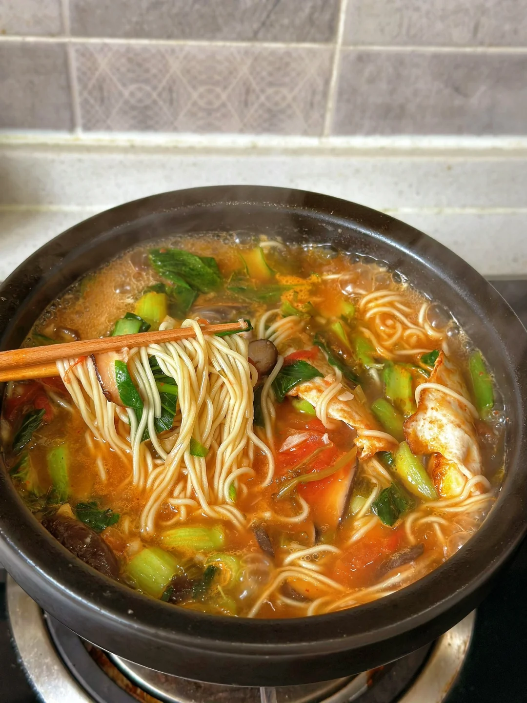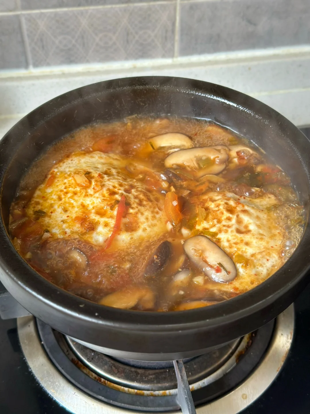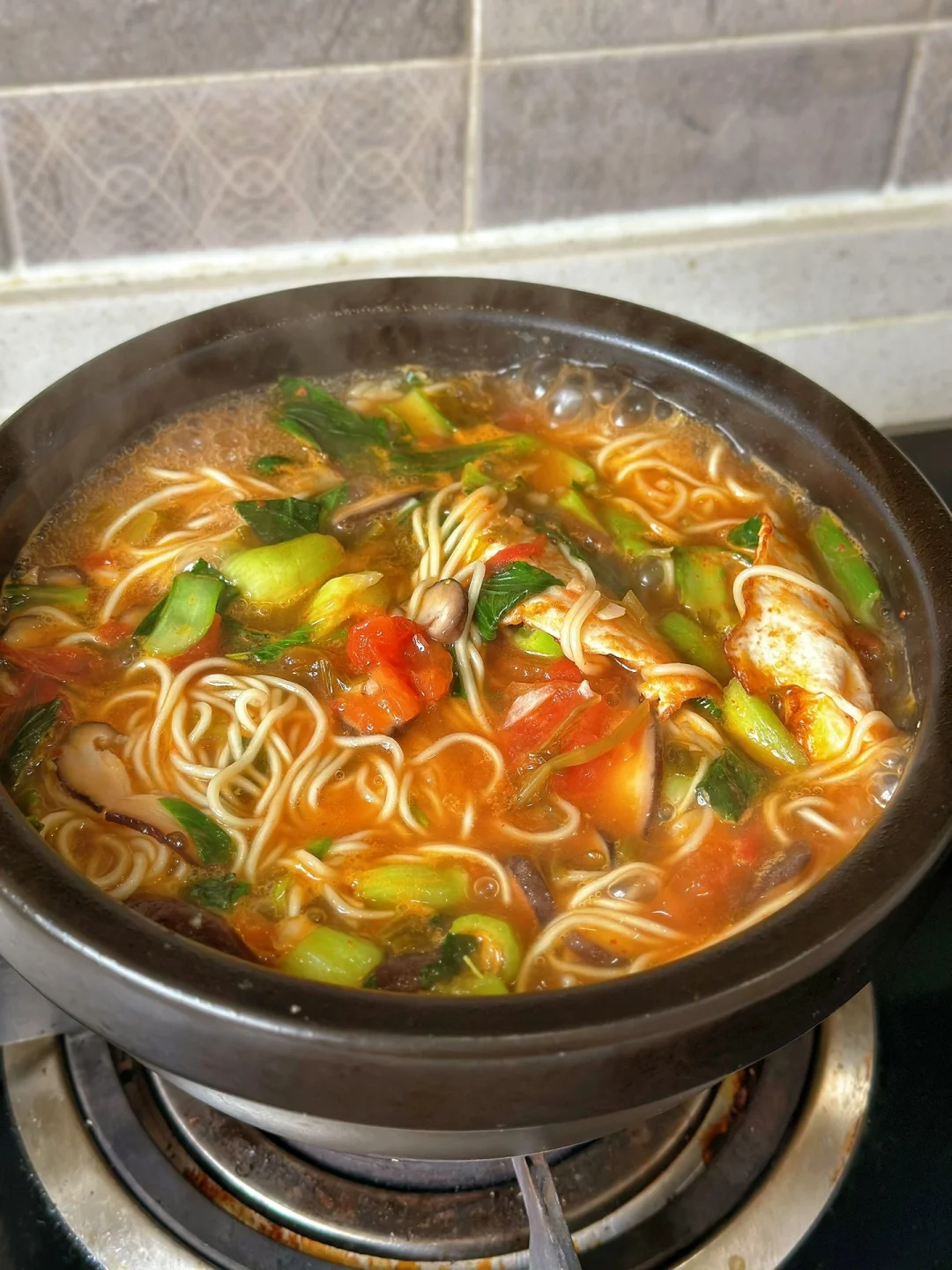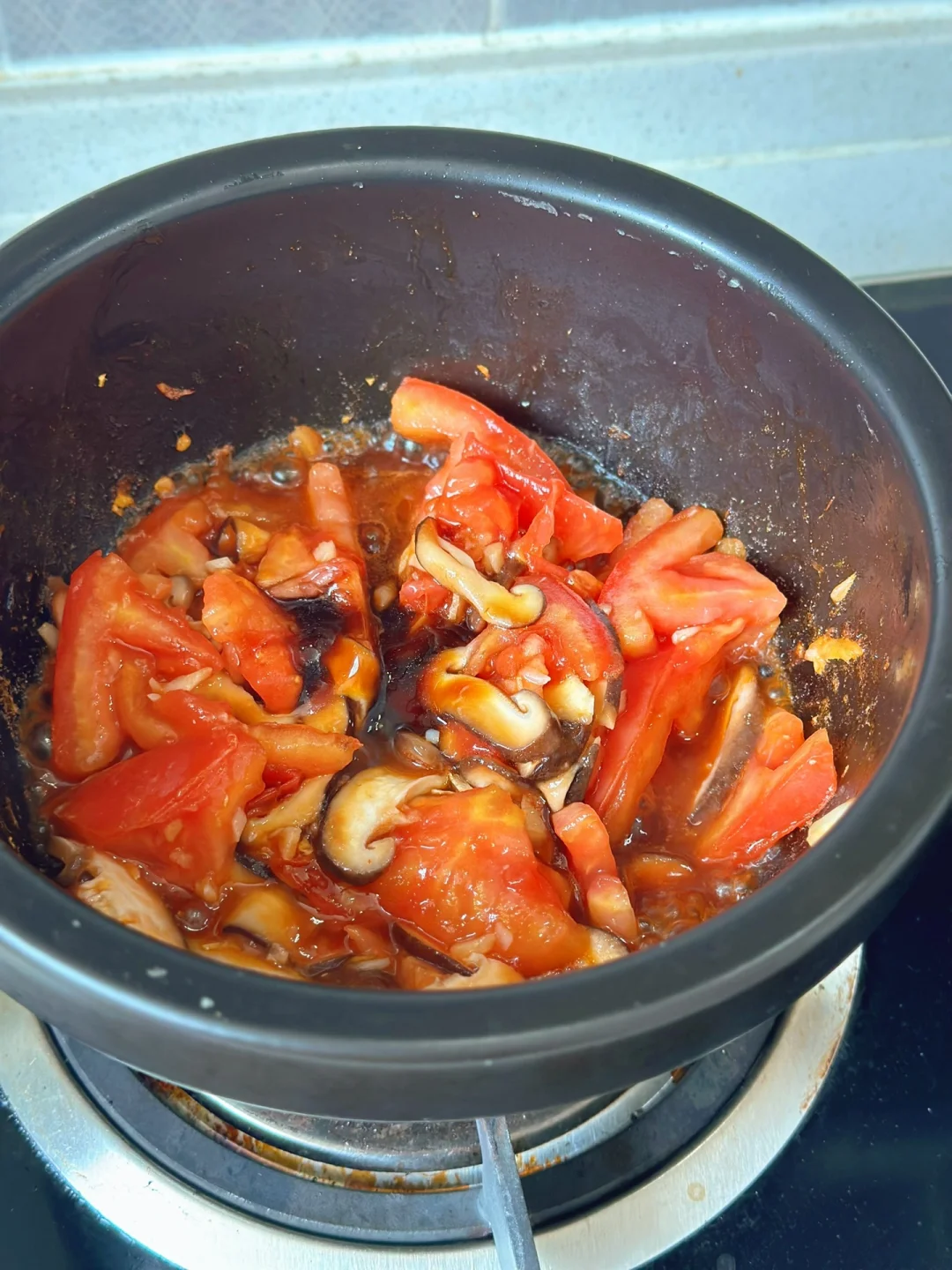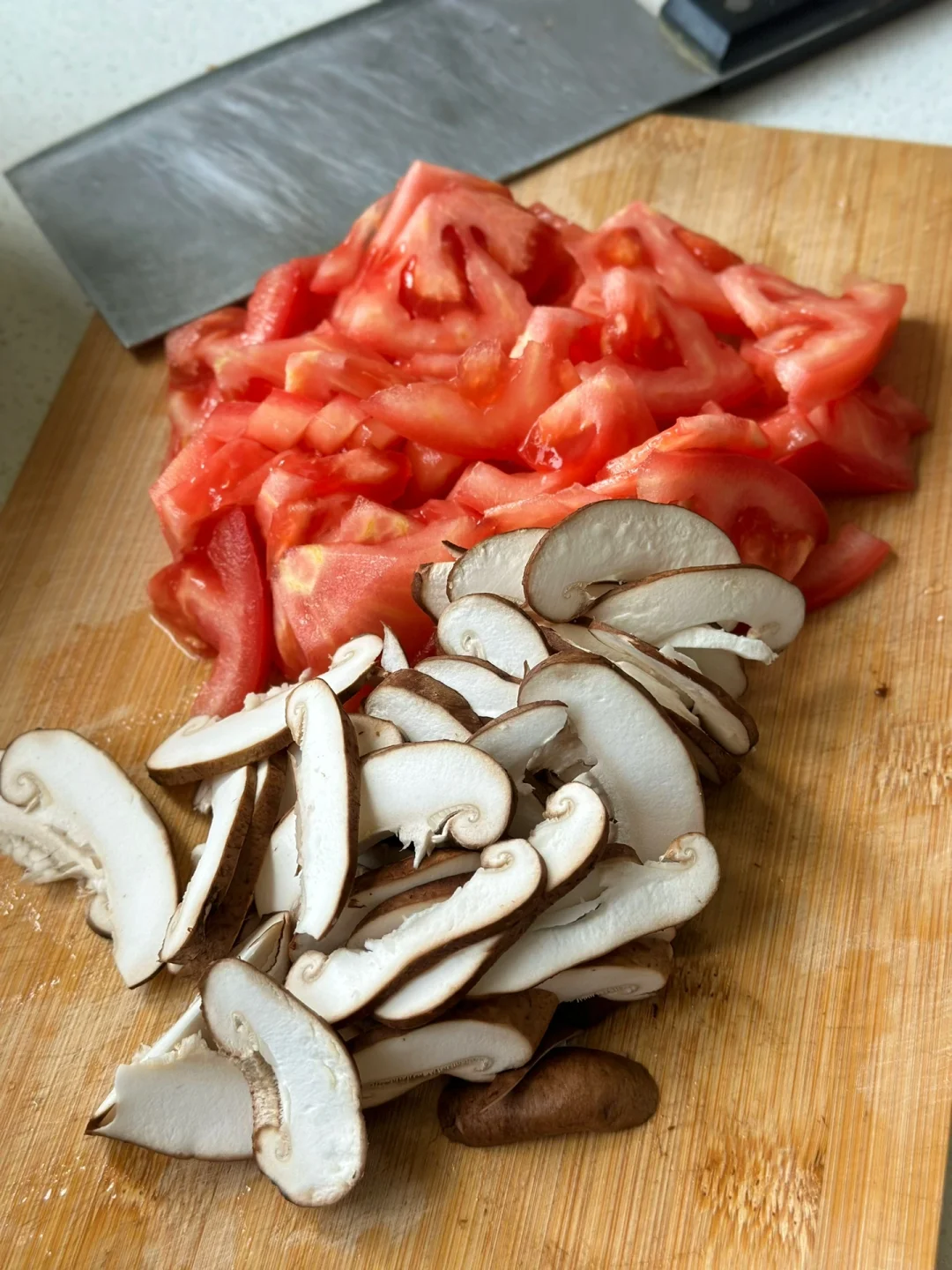 1.番茄两个香菇少许,其他的配菜可以根据自己的喜好来 2.小火爆香大蒜生姜末把番茄放进去翻炒两三分钟再加入两大勺番茄酱快炒出沙,然后把香菇片也放进去一起翻炒加入一勺生抽一勺蚝油少许糖 3.加入适量的开水,然后把煎好的两个荷包蛋放进去,一起煮一会儿只汤入味加入适量盐鸡粉调味 4.建议你们用另外一个锅子把面条煮至八成熟以后再放到这个汤里面出锅前放入自己喜欢的青菜就可以啦