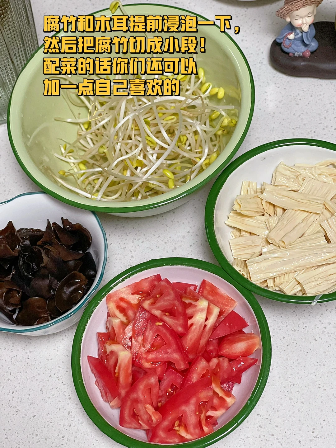 番茄腐竹木耳汤 不知道从什么时候开始,我们番茄在我们家餐桌上出现的频率还挺高的,平时煮面条煮汤都放一些很开胃!今天分享的这款就很营养还减肥呢 1. 腐竹和木耳提前浸泡一下,然后把腐竹切成小段!配菜的话你们还可以加一点自己喜欢的 2. 小火爆香蒜末把切好的番茄片倒入一半进去翻炒(留一半儿等会儿有用) 3. 加入两大勺番茄酱进去小火炒出沙,这样的话味道会更浓郁些 4. 在加入适量的水煮一会儿最加入适量盐鸡粉调味,再把腐竹木耳放进去煮至七成熟的时候再把剩余的番茄片倒进去出锅前撒葱花就可以了