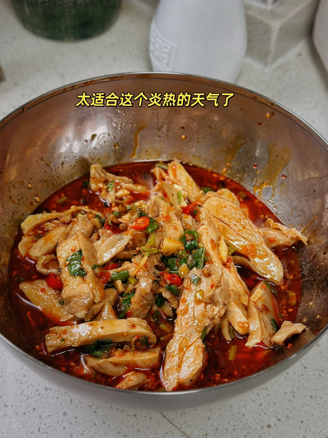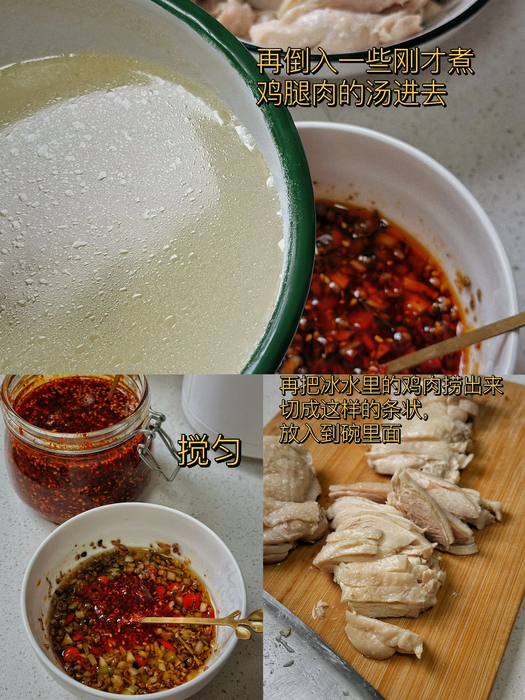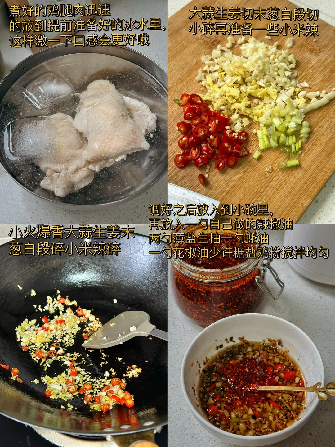 4. 煮好的鸡腿肉迅速的放到提前准备好的冰水里,这样激一下口感会更好哦