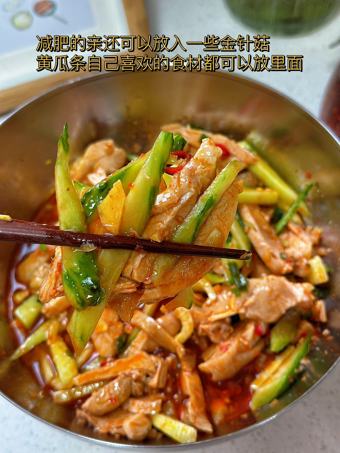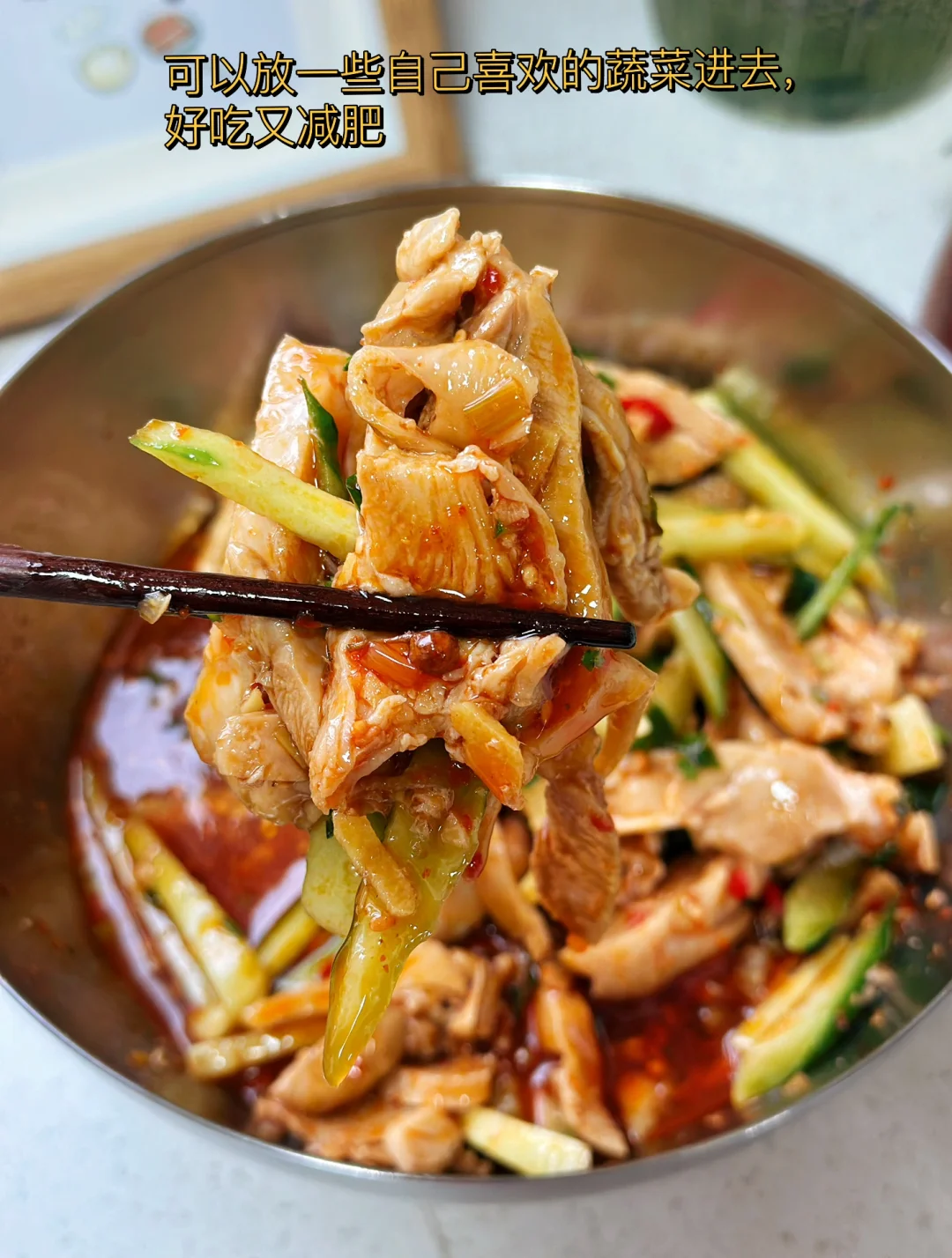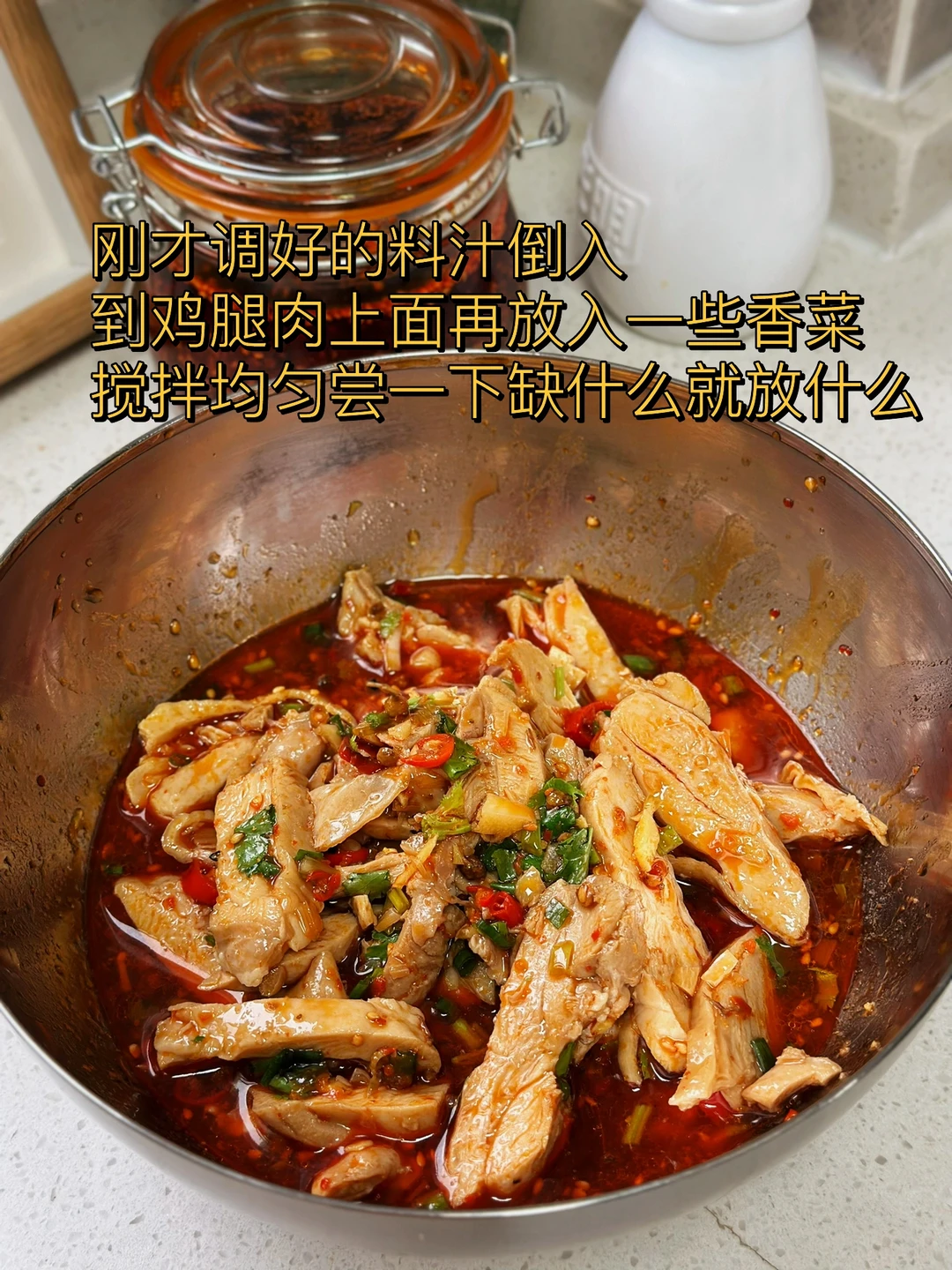 9. 刚才调好的料汁倒入到鸡腿肉上面再放入一些香菜搅拌均匀尝一下缺什么就放什么,减肥的亲还可以放入一些金针菇黄瓜条自己喜欢的食材都可以放里面