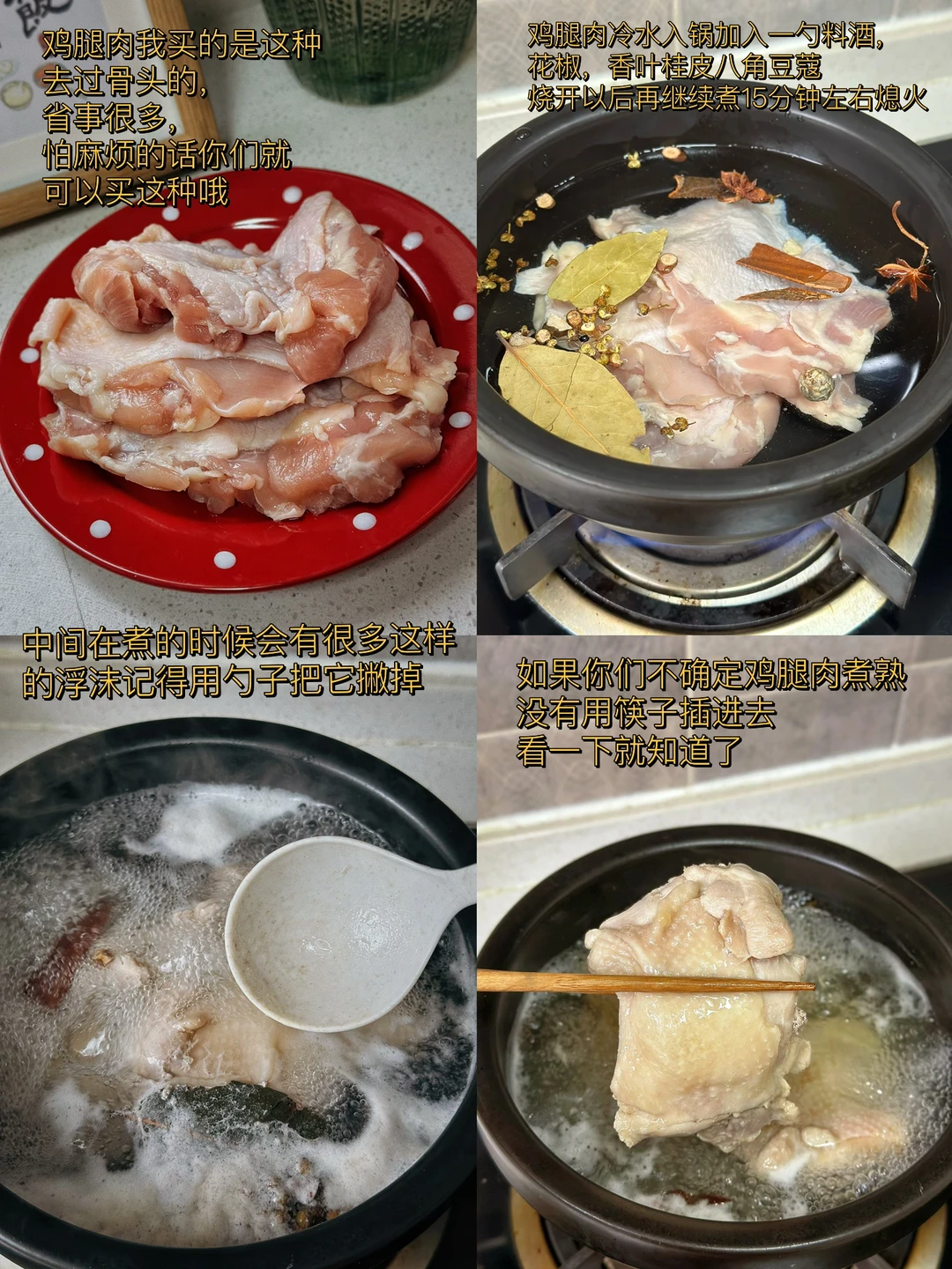 3. 中间在煮的时候会有很多这样的浮沫记得用勺子把它撇掉,如果你们不确定鸡腿肉煮熟没有用筷子插进去看一下就知道了