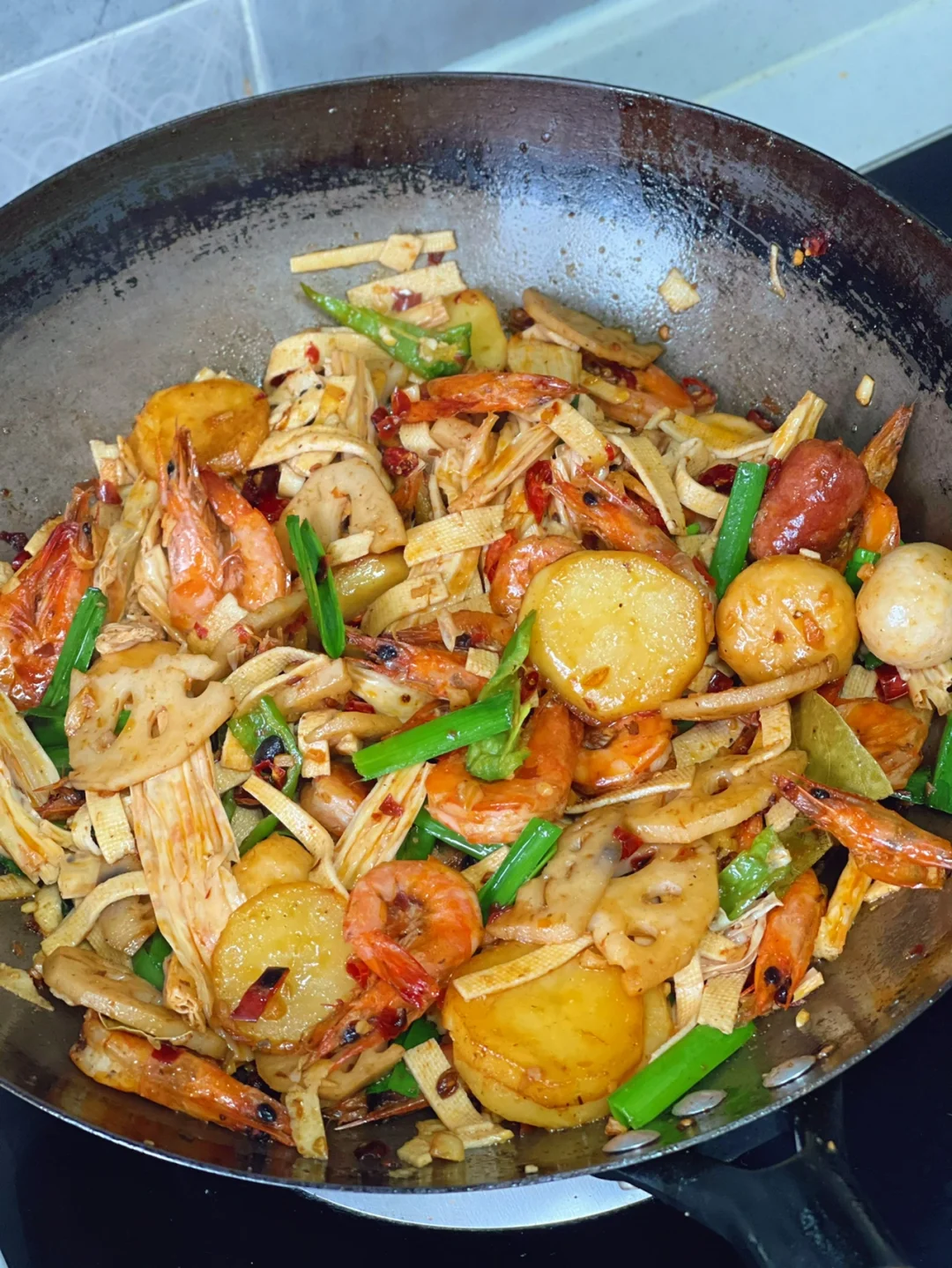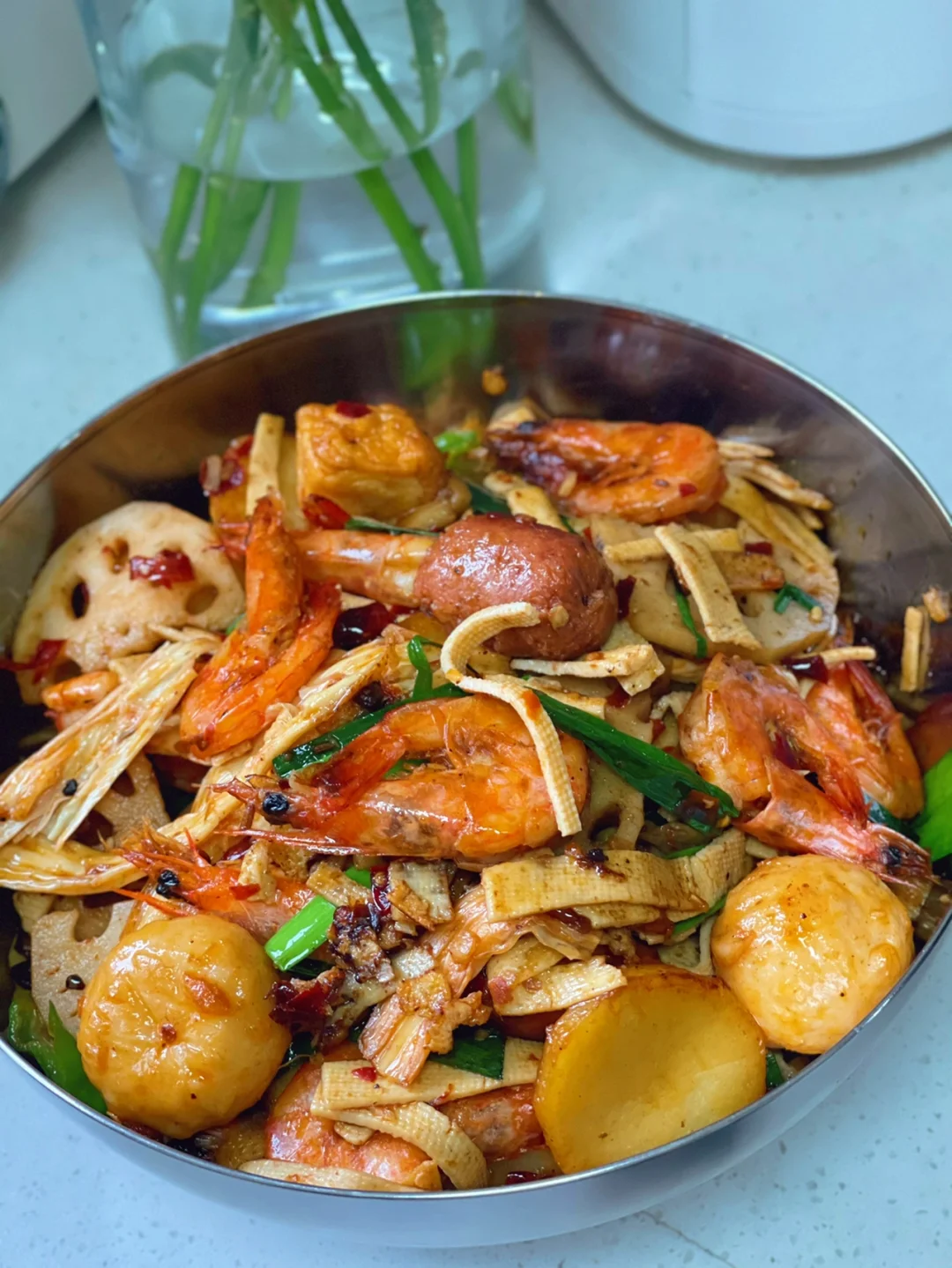我们是前一天吃火锅,剩下的很多配菜刚好就拿来做了麻辣香锅还挺丰盛,食材可以根据自己的喜好更换