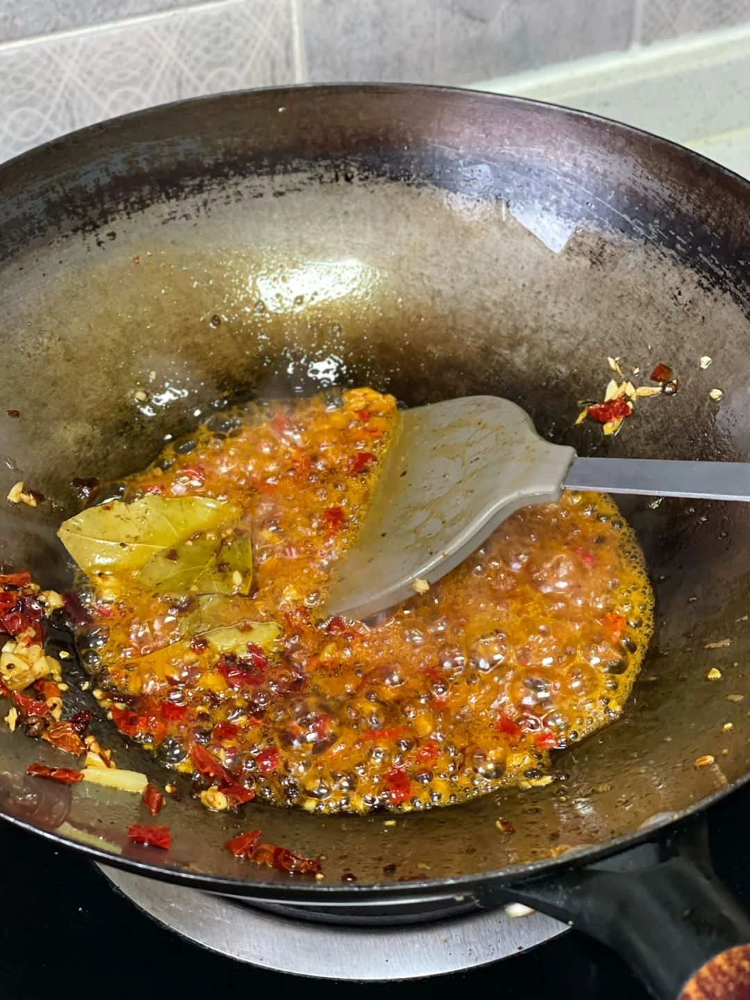 3.锅里放入稍微多一点的油大蒜生姜干辣椒碎放进去小火炒香,再加入一块儿香辣火锅底料,我还放了两片香叶,少许花椒,继续炒出红油