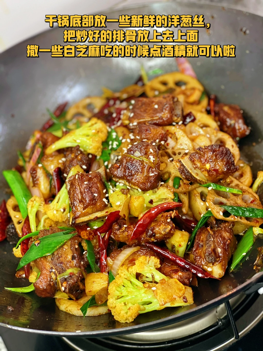 10. 干锅底部放一些新鲜的洋葱丝,把炒好的排骨放上去上面撒一些白芝麻吃的时候点酒精就可以啦