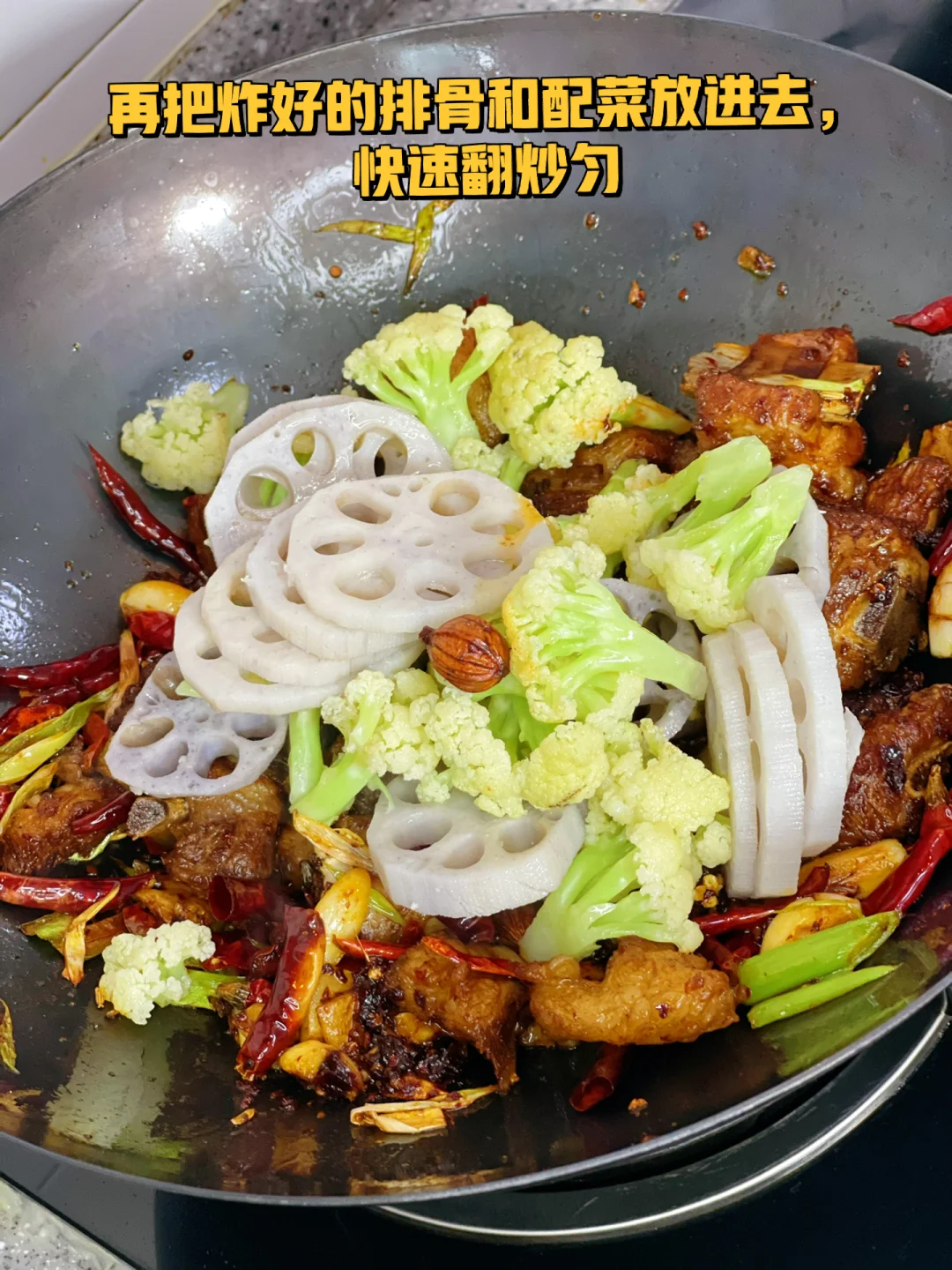 8. 再把炸好的排骨和配菜放进去,快速翻炒匀