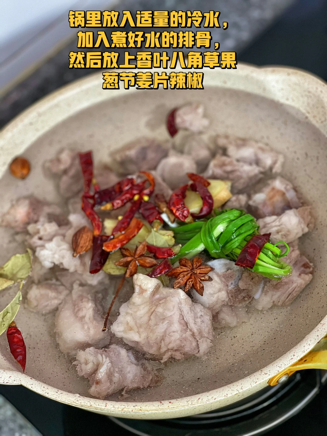 1. 锅里放入适量的冷水,加入煮好水的排骨,然后放上香叶八角草果葱节姜片辣椒