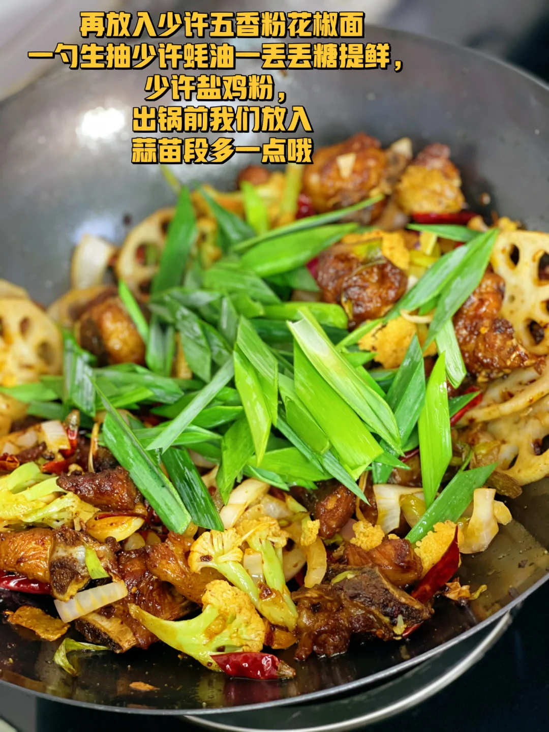 9. 再放入少许五香粉花椒面一勺生抽少许蚝油一丢丢糖提鲜,少许盐鸡粉,出锅前我们放入蒜苗段多一点哦