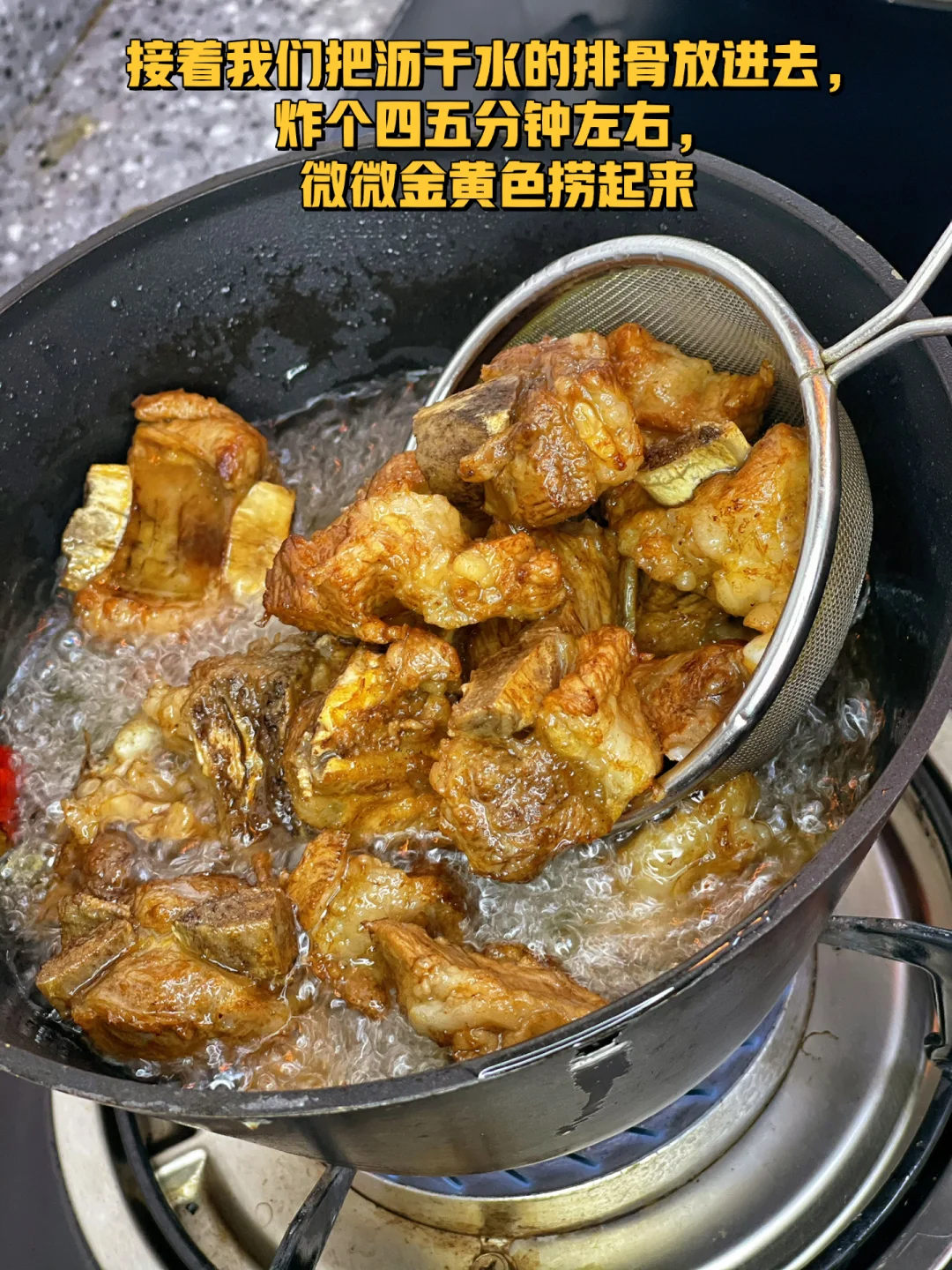 6. 接着我们把沥干水的排骨放进去,炸个四五分钟左右,微微金黄色捞起来