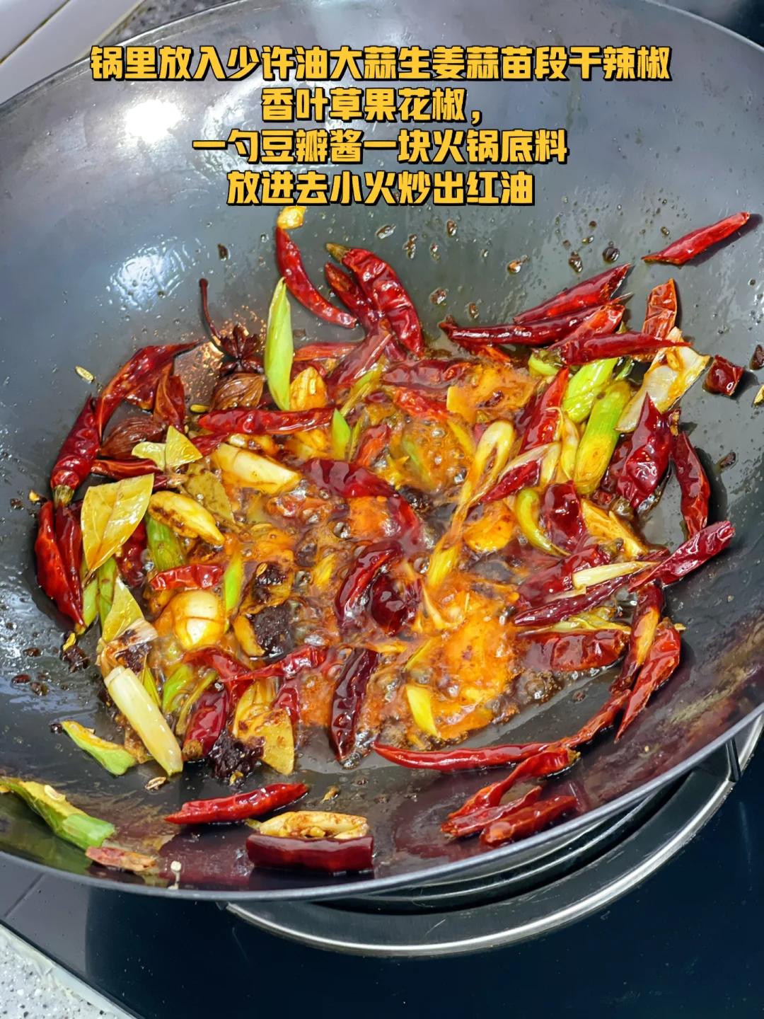 7. 锅里放入少许油大蒜生姜蒜苗段干辣椒香叶草果花椒,一勺豆瓣酱一块火锅底料放进去小火炒出红油