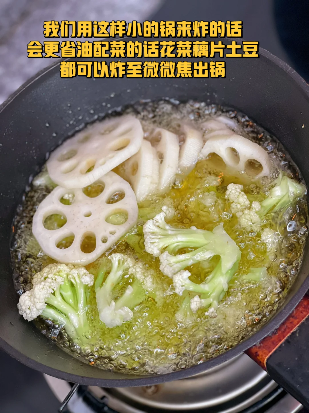 5. 我们用这样小的锅来炸的话会更省油配菜的话花菜藕片土豆都可以炸至微微焦出锅