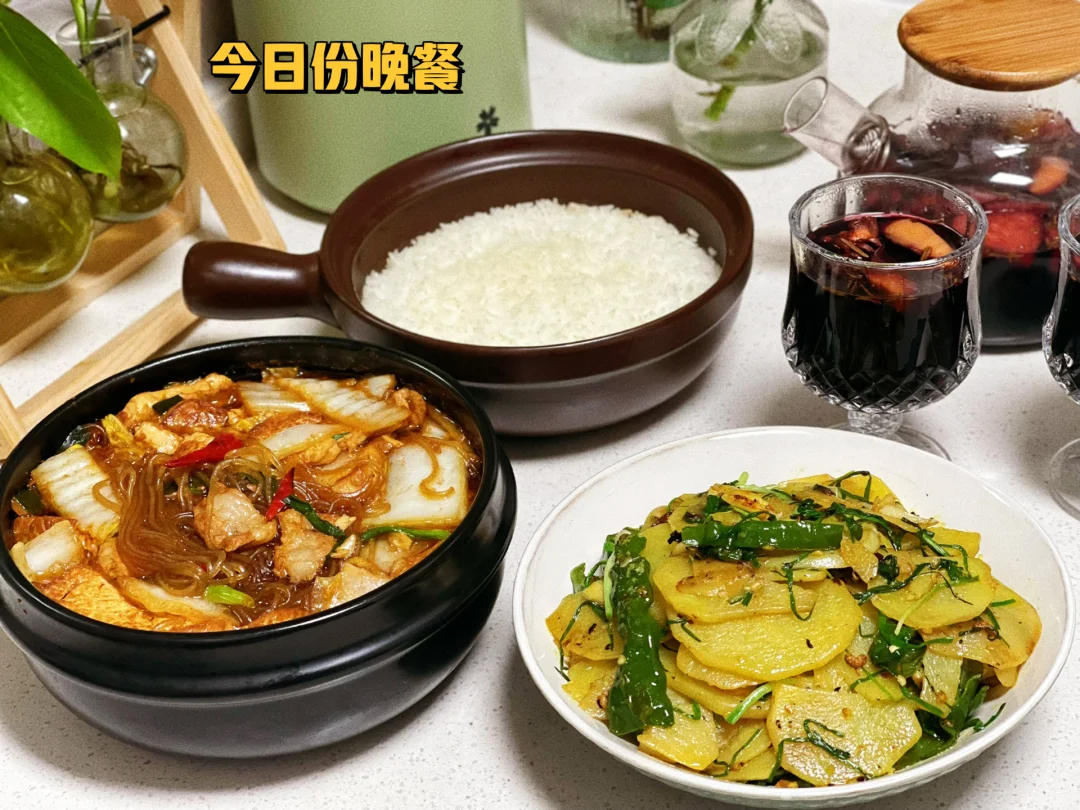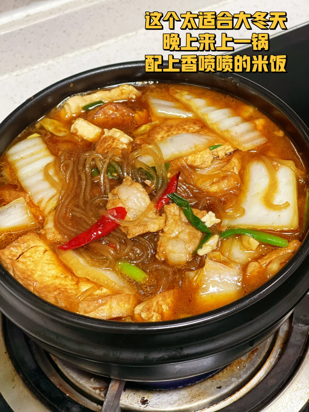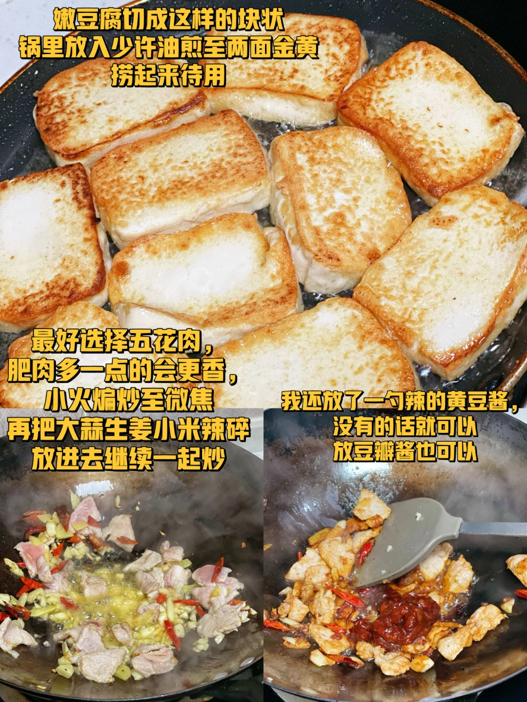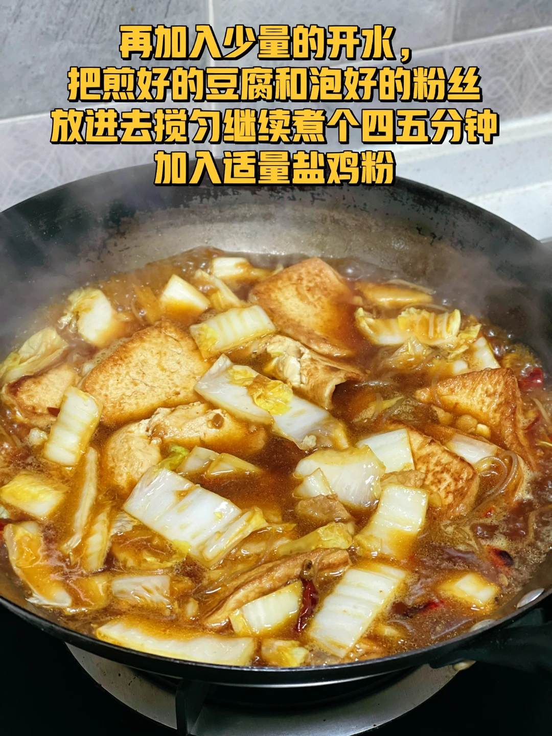 想吃这个白菜肉炖粉条很久了,但是种种原因,一直都没有折腾上昨天特意去买了块豆腐,今天煎了一下就炖上了就是有点费饭,下次粉条还要多放一点太好吃了 1. 嫩豆腐切成这样的块状锅里放入少许油煎至两面金黄捞起来待用 2. 最好选择五花肉,肥肉多一点的会更香,小火煸炒至微焦再把大蒜生姜小米辣碎放进去继续一起炒 3. 我还放了一勺辣的黄豆酱,没有的话就可以放豆瓣酱也可以 4. 再把白菜梗切成块状放进去转大火快速翻炒两三分钟加入一勺生抽一勺蚝油半勺老抽少许糖炒匀 5. 再加入少量的开水,把煎好的豆腐和泡好的粉丝放进去搅匀继续煮个四五分钟加入适量盐鸡粉 6. 喜欢吃叶子的可以把叶子放进去煮个两三分钟出锅前加入少许葱花段搅匀就可以了 7. 喜欢汤泡饭的,可以汤稍微多放一些 8. 这个太适合大冬天晚上来上一锅配上香喷喷的米饭