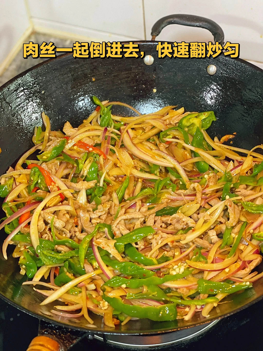 8. 接着把切好的青椒丝洋葱丝倒进去