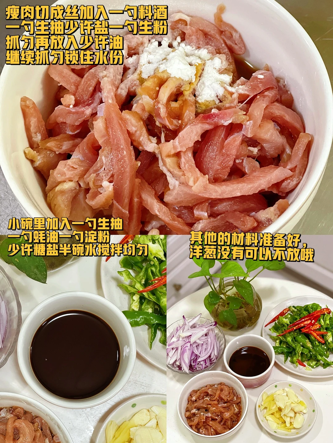 1. 瘦肉切成丝加入一勺料酒一勺生抽少许盐一勺生粉抓匀再放入少许油继续抓匀锁住水份