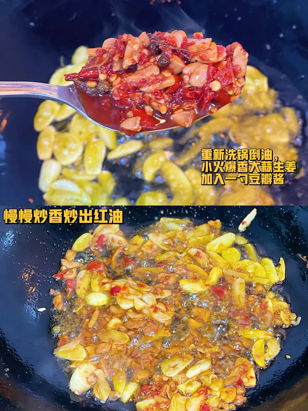 6. 重新洗锅倒油,小火爆香大蒜生姜加入一勺豆瓣酱