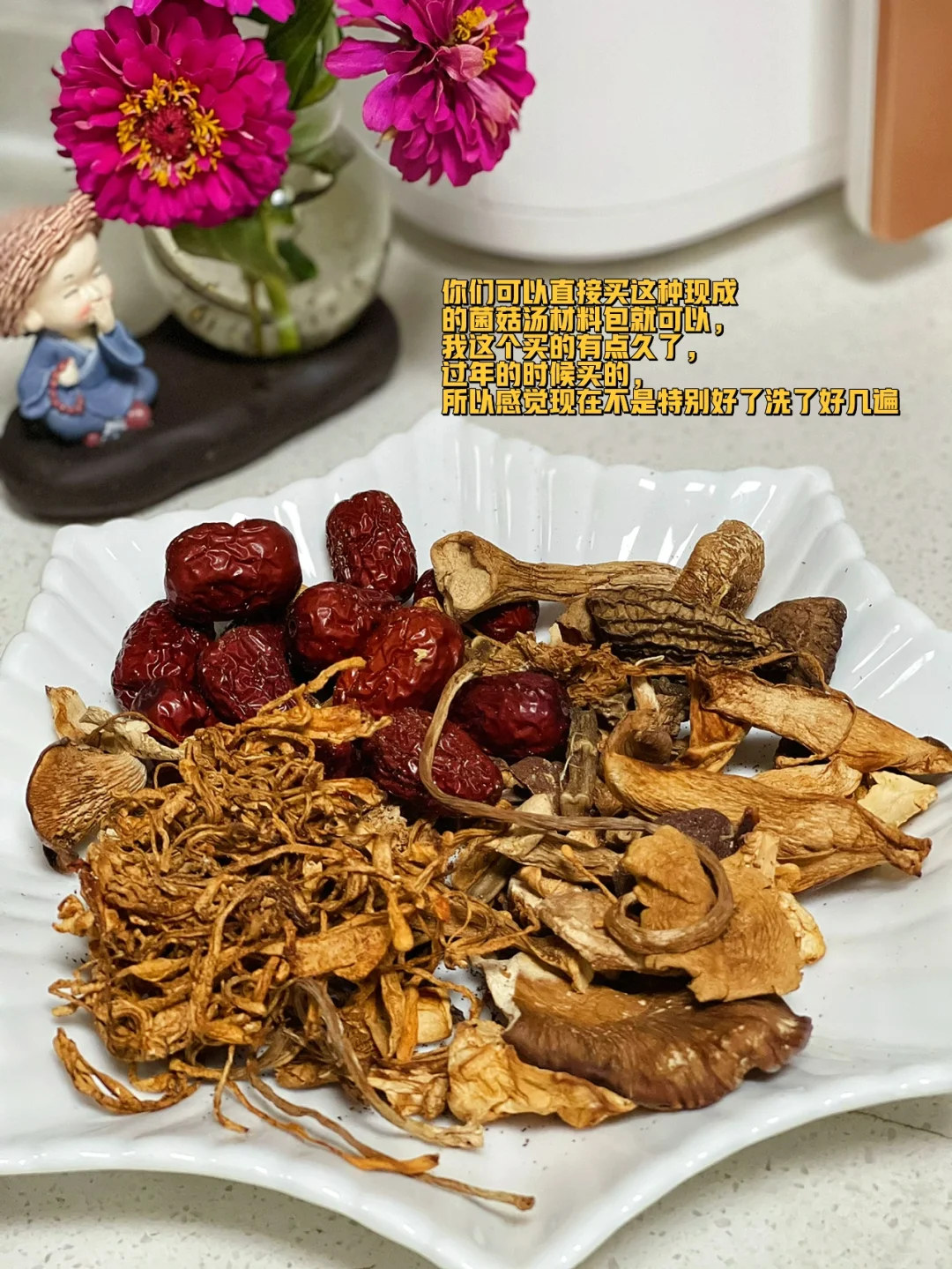 1.你们可以直接买这种现成的菌菇汤材料包就可以,我这个买的有点久了,过年的时候买的,所以感觉现在不是特别好了洗了好几遍