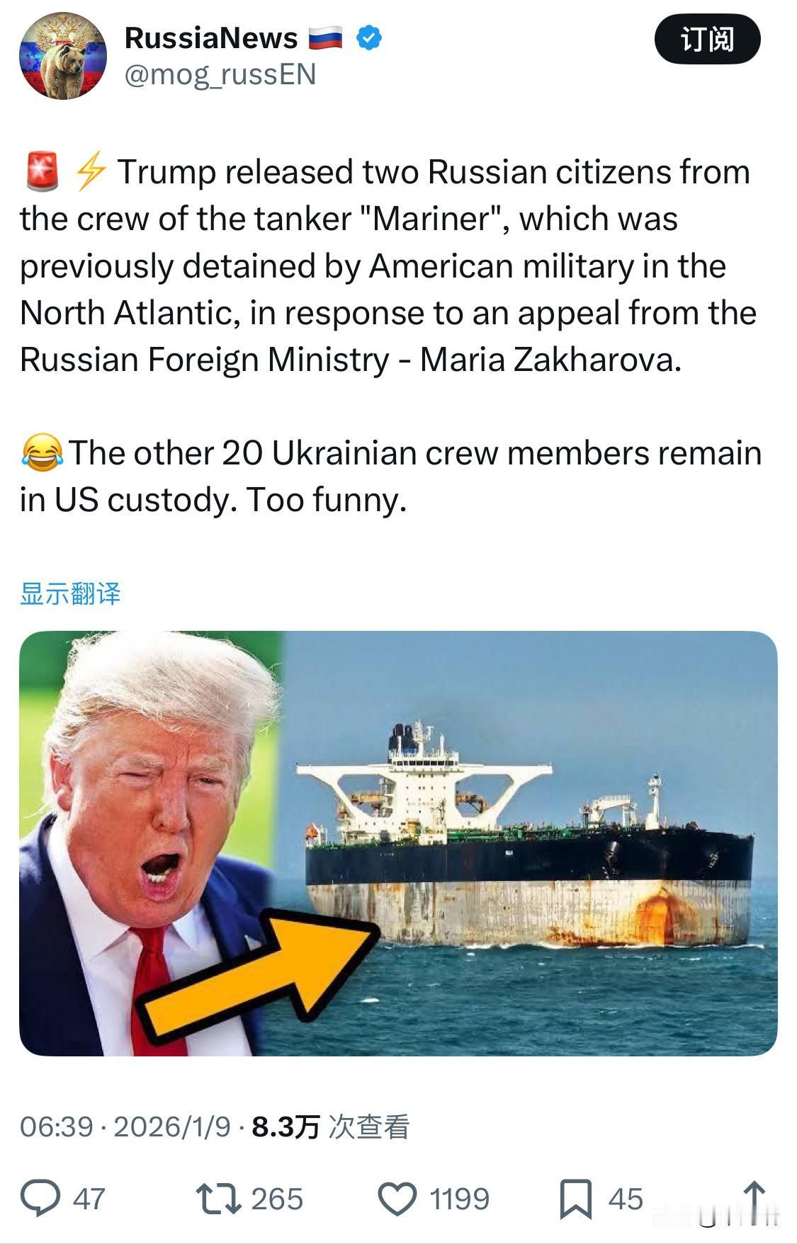 应俄罗斯外交部的呼吁,特朗普释放了此前被美国军方扣押在北大西洋的“水手号”油轮上的两名俄罗斯公民——俄罗斯外交部新闻发言人玛丽亚·扎哈罗娃。 其余20名乌克兰船员仍被美国拘留。太滑稽了。