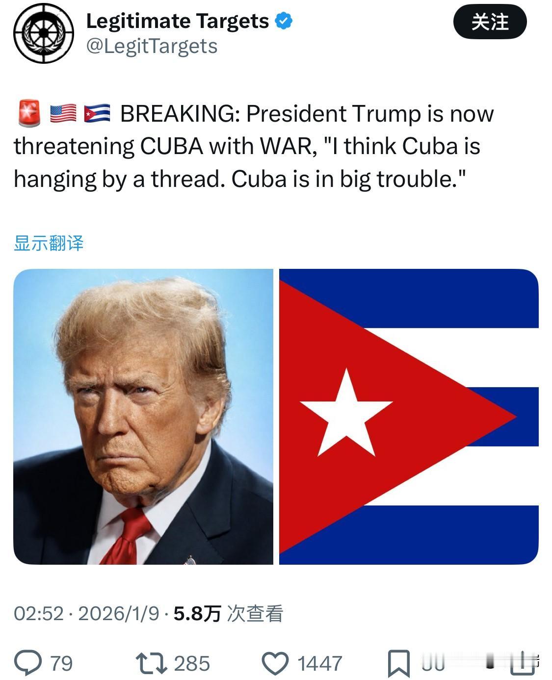 突发新闻:特朗普总统威胁要对古巴发动战争,“我认为古巴岌岌可危。古巴处境非常糟糕。”