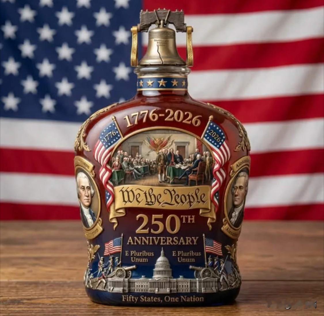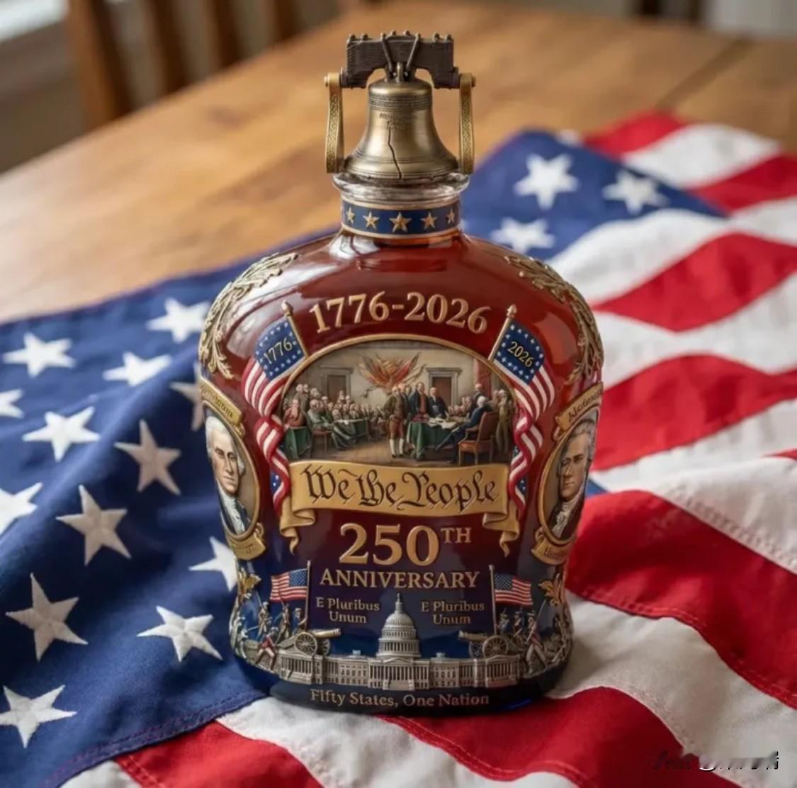 一款纪念美国成立250周年(1776-2026年)而制作的纪念版威士忌酒,瓶身饰有独立宣言签署场景、美国国旗、自由钟瓶盖,适合历史爱好者和收藏家收藏,或作为特殊场合的礼品。