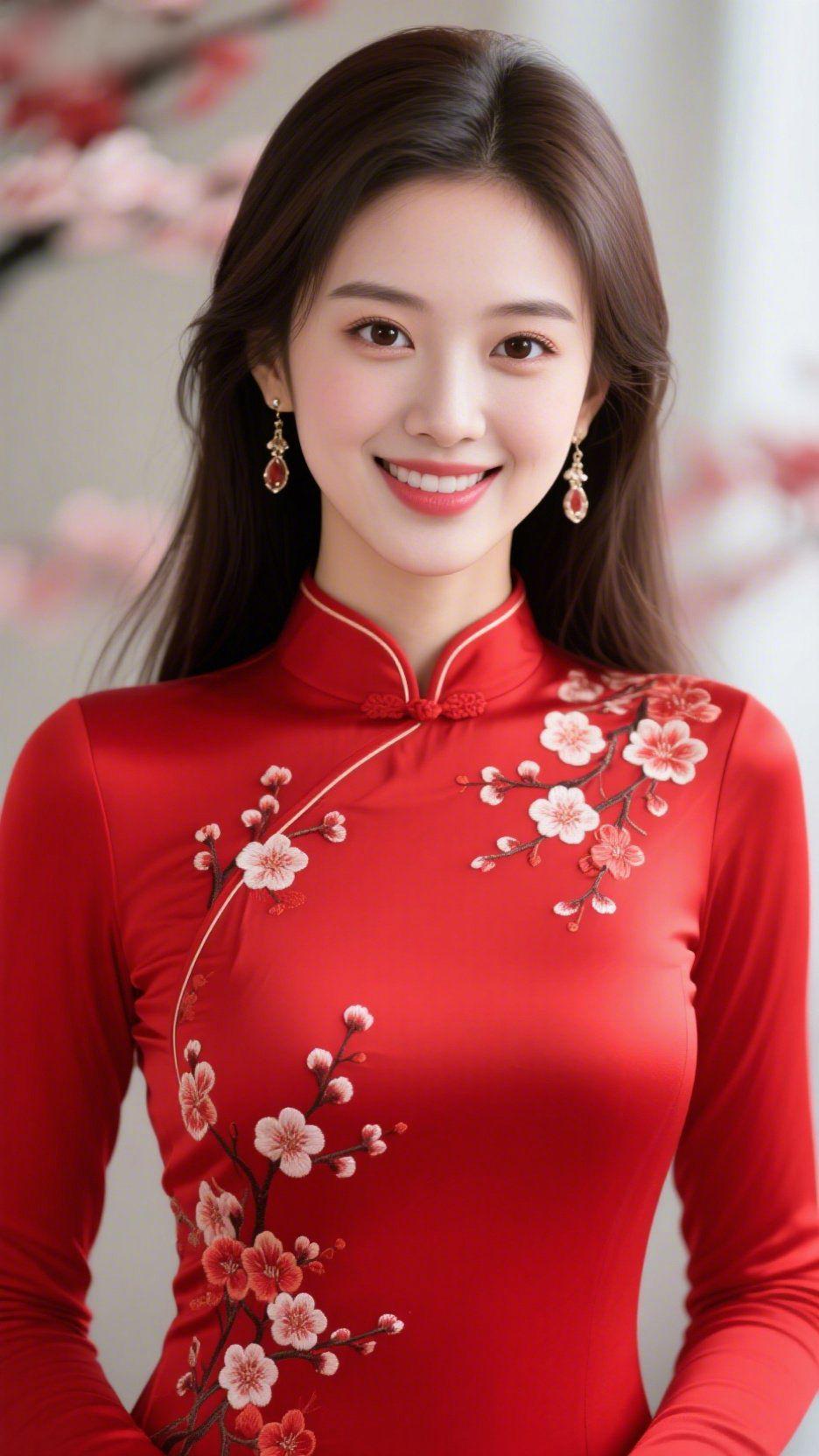 红襟载梅春 暖光轻落肩头时,正红旗袍裹着绣梅,浸在了春的柔意里。 领口盘扣缀着细金的温,绣梅从襟侧斜铺——粉白瓣尖沾着绣线的软,像把枝上初绽的春,妥帖缝进了衣袂。长发松垂肩后,耳坠摇着细碎的光,笑意漫开时,连背景里的花影都轻软了几分。 这红是恰好的暖,梅是温柔的春,衬着舒展的神色,像把春日的轻甜揉进了一身妥帖里。原来舒展的好看从不是张扬的艳,是这样自然的温软,让目光落上去时,都跟着轻缓下来。 红襟绣梅 春衣温软