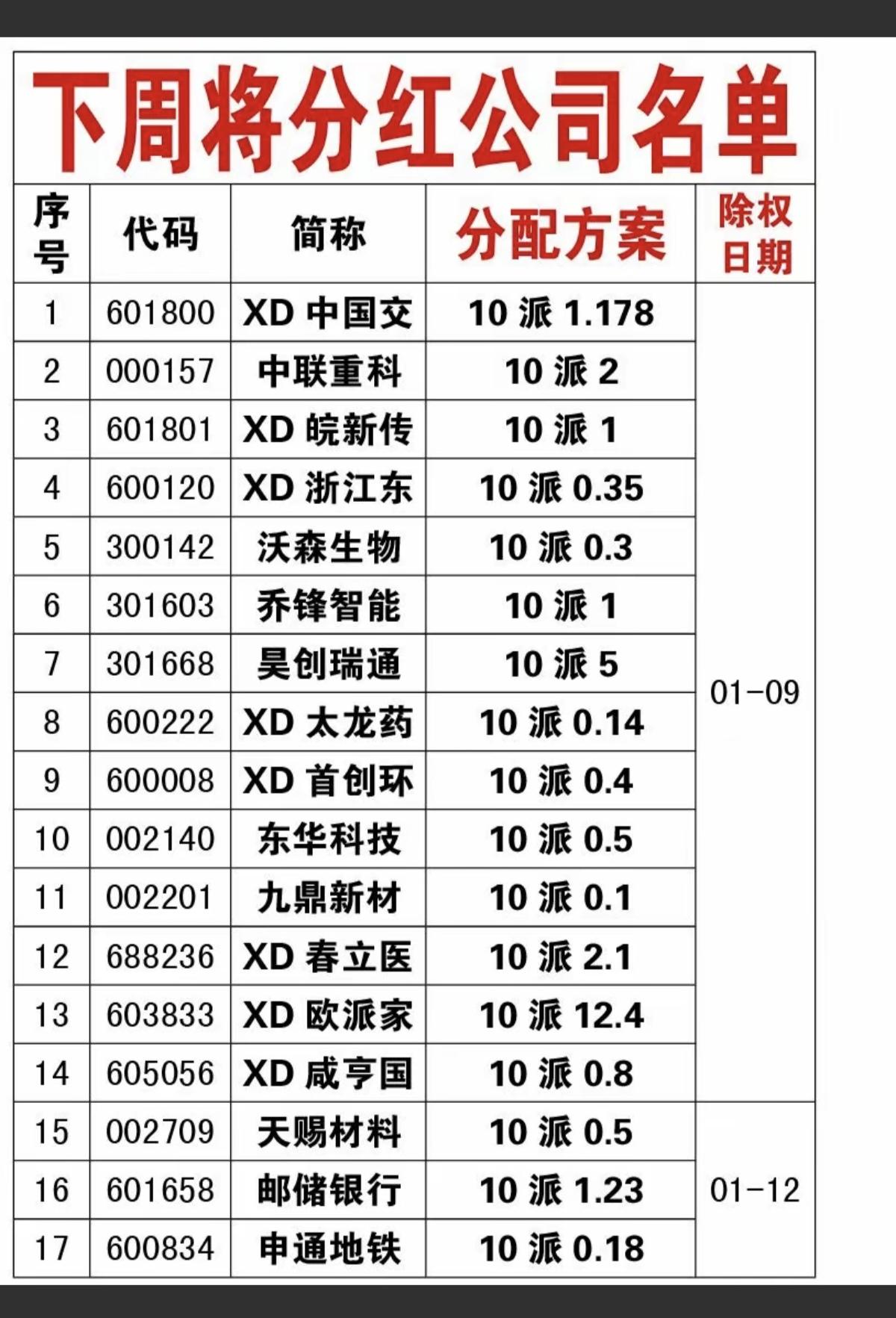 1.10周六 下周将分红公司名单! 长期持有分红还是不错的回报。 高股息高回报,才是价值投资。在现阶段比存银行,收益要高一些。 短期可以考虑回避。