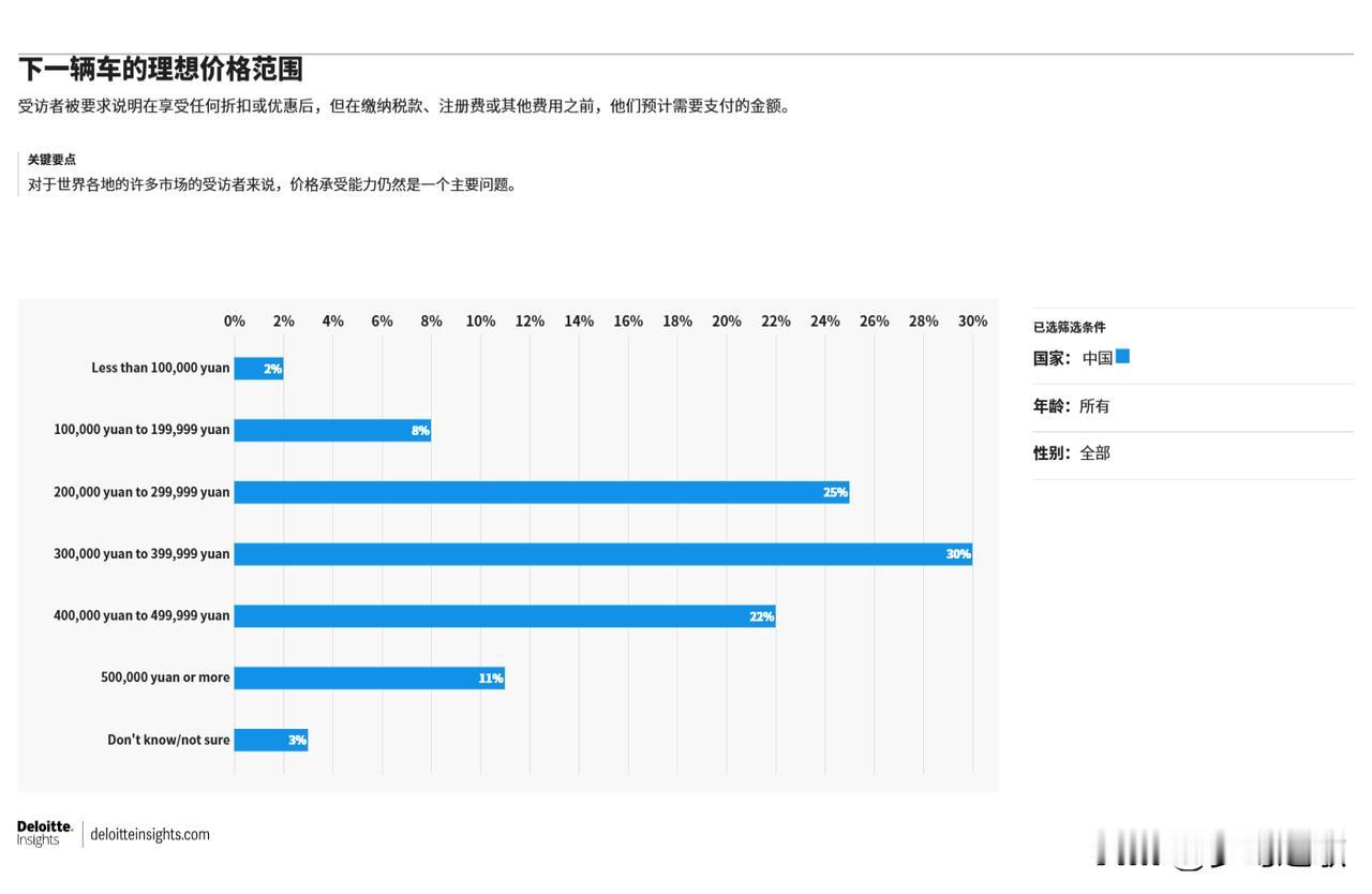 中国人现在是真的有钱,下一辆车平均在30万以上 德勤做了一项调查,对有车一族来说更多中国人意愿是下一辆车更倾向于买30万以上的高端车。 这充分说明国内中高收入群体规模在扩大,居民可支配收入提升后,对汽车的需求从“代步工具”转向“品质体验”,愿意为更高的性能、舒适感、品牌附加值买单;同时也体现出增换购需求成为汽车消费的主力,首购人群占比下降,二次及以上购车用户更追求升级体验。 关键有30万元闲钱买车,更加说明居民手里有钱,对于消费只是更加理性,而不是居民手里没钱不愿意消费。