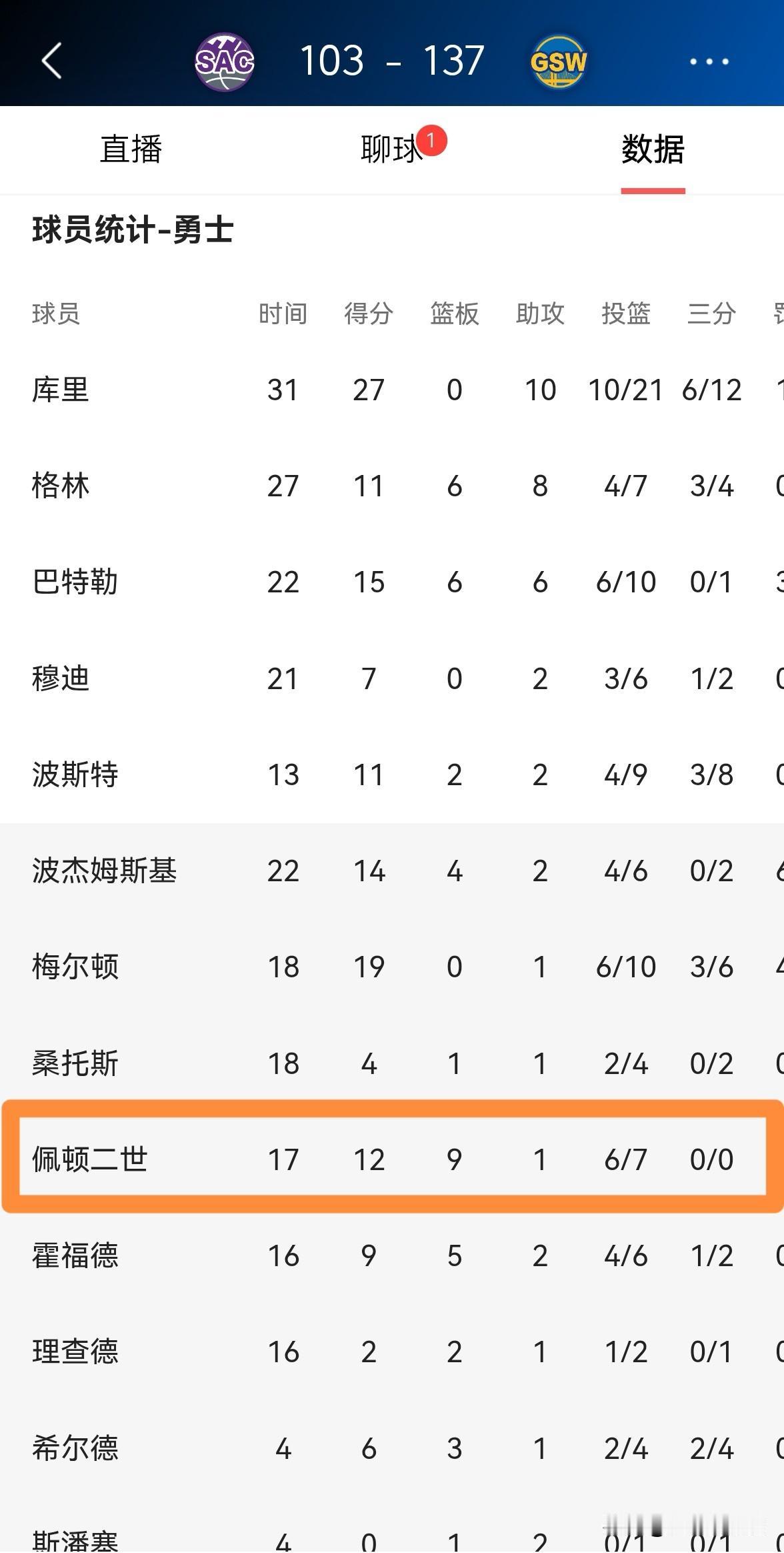 我必须要怒赞勇士悍将小佩顿!在今天勇士主场以137:103大胜国王的比赛中,小佩顿在攻防两端的表现堪称完美。 全场比赛下来,小佩顿替补出战17分钟,投篮7中6非常高效的砍下12分,还有9篮板1助攻,没有失误和犯规,他的场上正负值为+9。