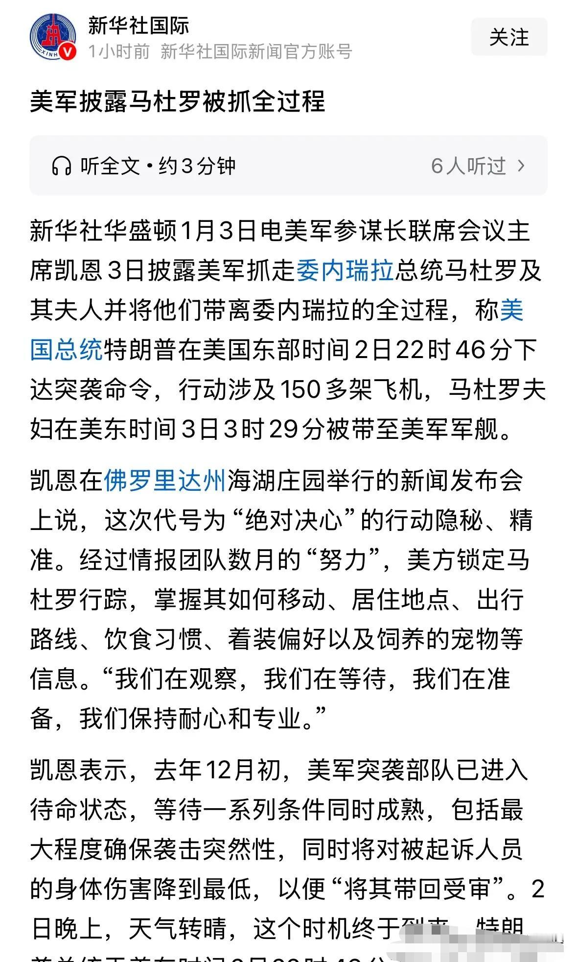 在马杜罗被拖走的最后时刻,地面杀出一个孤胆英雄!他一个人扛着防空导弹锁定美军直升机,虽没能改变战局,但证明:还有人的骨头是硬的 麻烦各位读者点一下右上角的“关注”,留下您的精彩评论与大家一同探讨,感谢您的强烈支持! 美国icon绑架马杜罗icon的行动中,确实有一名士兵发射了一枚肩扛式的防空导弹。 这枚导弹击中了一架直升机,但是并没有造成太严重的损坏。 一部分美军icon士兵受伤,并没有造成人员死亡。 在马杜罗即将被拖离那危机四伏之地的最后紧要关头,战场上突然横空杀出一个堪称“孤胆英雄”的人物!彼时,没有雷达在背后提供精准的情报支援,也没有战友在身旁构筑起严密的掩护火力网,他孤身一人,毅然扛起防空导弹,那坚定的眼神紧紧锁定了美军盘旋在空中的直升机。 马杜罗还是被卖掉的。 他是被立体全方位身边的人给卖掉的。 如果他身边的近卫军icon勇敢的抵抗的话。 那么他库存里的肩扛式导弹,绝对可以把这些三角洲部队全部绝杀。 武装直升机对抗这种肩扛式导弹根本毫无办法。 很遗憾,大部分军队全都,停止了抵抗。 只有一名士兵,勇敢的发射了导弹。 美军一架飞机被击中,但仍可飞行。很多古巴icon保镖还被打死了。没见到瓦格纳和俄国icon雇佣兵的消息。 尽管这一发承载着无畏勇气的导弹,最终未能扭转整个战局的走向,但它却如同一记响亮的耳光,重重地打在了那些背叛者的脸上,有力地证明了:在那个被出卖、被黑暗笼罩的夜晚,仍有人骨子里透着不屈的硬气,脊梁挺得笔直!