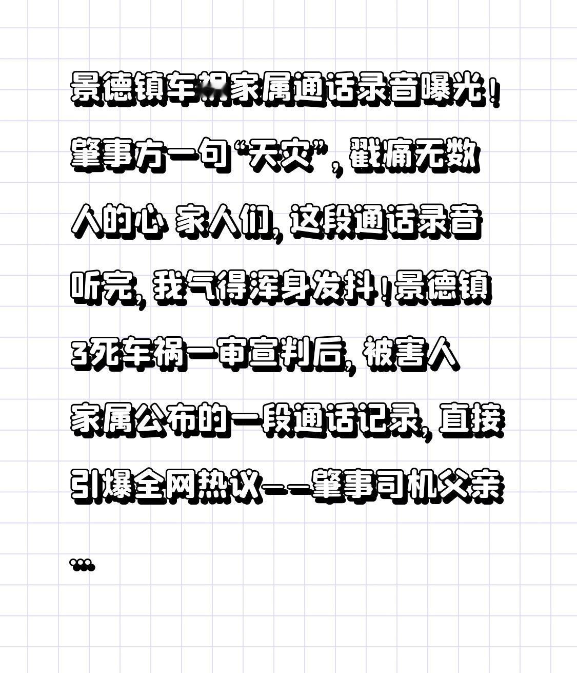 景德镇车祸家属通话录音曝光!肇事方一句“天灾”,戳痛无数人的心 家人们,这段通话录音听完,我气得浑身发抖!景德镇3死车祸一审宣判后,被害人家属公布的一段通话记录,直接引爆全网热议——肇事司机父亲一句“你儿子出门被撞死,还能怪我啊?这是天灾!”,把受害者家属的悲痛狠狠踩在脚下。 2024年10月2日的景德镇晚高峰,本是普通的下班路,却成了一个家庭的终点。31岁的胡某抱着11个月大的儿子,牵着30岁的妻子过马路,一辆特斯拉突然以129km/h的速度冲过来(该路段限速40km/h),瞬间撞碎了这个三口之家。孩子当场离世,夫妻二人经抢救无效也相继离去,三条鲜活的生命,在短短几秒内消逝 。 更让人愤怒的是,这场悲剧的起因竟是一场幼稚的口角。肇事司机廖某宇和同车朋友因“鹦鹉学舌距今多少年”争执,情绪愤懑之下,他在晚高峰人流密集的主干道猛踩油门,连续14秒将车速飙到极限,即便朋友哭喊劝阻也不停手,最终酿成惨剧 。 然而,比车祸更寒心的是肇事方家属的态度。案发后,被害人家属试图沟通,却接到了肇事司机父亲的电话。录音里,对方不仅毫无歉意,反而理直气壮地辩解:“我儿子不是故意的,这是天灾,没法控制!他都踩刹车打方向了,没直接撞死你们就行了”,甚至嚣张放话“再加上几条人命也就那么回事”。 这番言论让本就沉浸在悲痛中的受害人家属彻底崩溃。他们失去了儿子、丈夫和年幼的孙子,换来的不是一句道歉,而是“天灾”的轻描淡写和二次伤害。2026年1月9日,法院一审以危险方法危害公共安全罪,判处廖某宇死缓,可被害人家属坚决表示要申请抗诉,“我要用余生,为儿孙一家三口讨公道” 。 网友们听完录音后炸开了锅:“129码的速度,是天灾还是人祸?这分明是漠视生命!”“犯错不可怕,可怕的是毫无悔意,这样的态度比车祸本身更伤人”“三条人命啊,怎么能说得如此轻飘飘?”。 其实,交通事故难免发生,但态度见人心。有的家庭会主动道歉、积极赔偿,用诚意化解矛盾;可有的家庭却选择推卸责任、恶语相向,让悲剧雪上加霜。法律能给出公正的判决,却难以抚平受害人家属心中的创伤。 每一起车祸的背后,都是破碎的家庭。希望所有司机都能牢记,方向盘上系着的是无数人的生命,敬畏规则就是敬畏生命。也愿每个犯错的人都能明白,道歉不是软弱,而是做人的底线。别让一时的冲动,毁掉两个家庭;更别让冷漠的态度,寒了整个社会的心。
