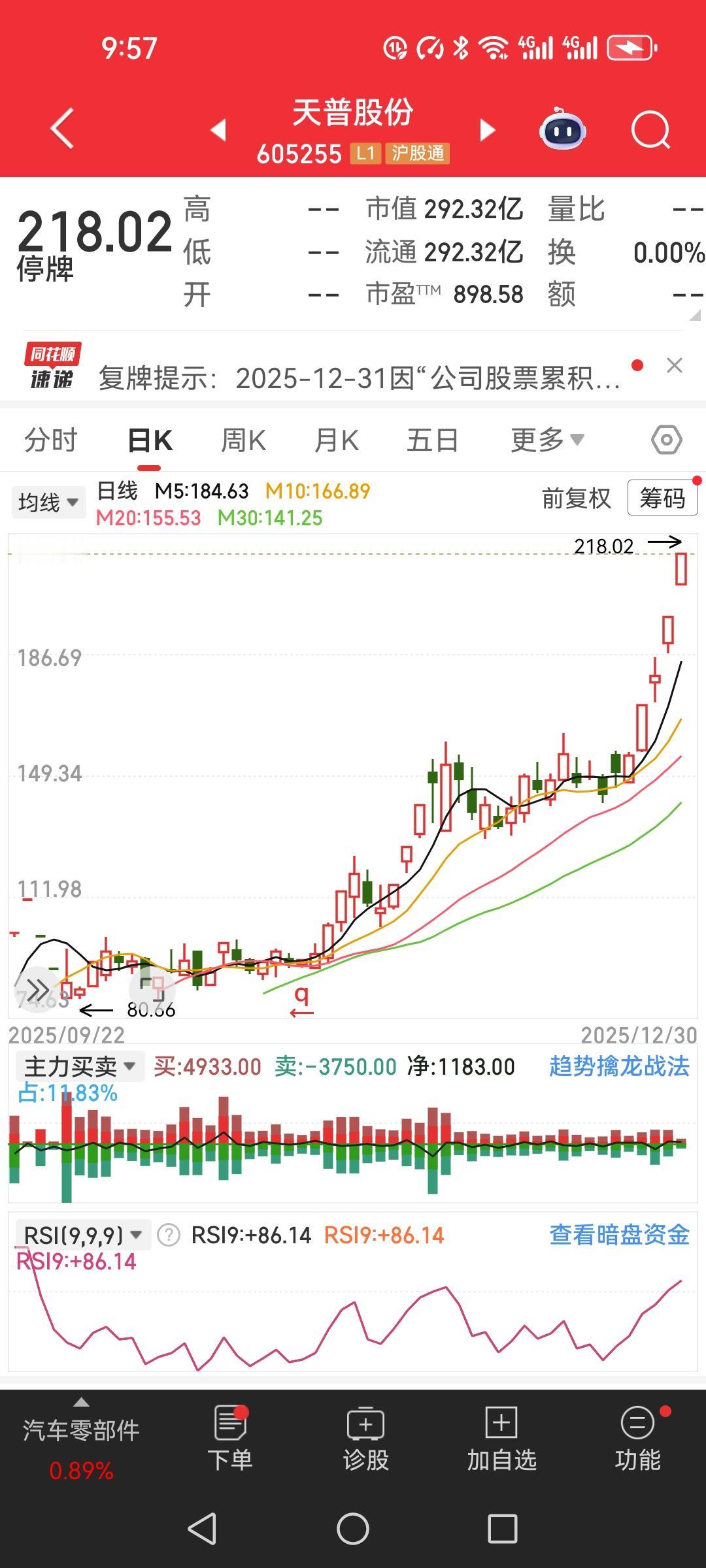 20倍的妖股神话,还是在违规披露信息被立案调查落下帷幕:狂欢背后谁在悄悄撤退? 11.58元到218元,天普股份仅仅了用一年的时间。 连续15个一字板,股价突破111元,主升浪如飓风席卷。如果百元横盘时入场,年末近200元离场,是不是又会创造一个“轻松翻倍”的财富传说。 直到一纸公告打破神话的泡沫:信息披露违规,证监会立案调查。 可主力早已悄然离场。二十倍利润落袋为安,未来可能的罚款,也不过是狂欢后的零头。 这场游戏里,有人带走了真金白银,有人却留下满地疑问。 当潮水退去,监管的铡刀落下时——究竟谁在裸泳?连板妖股 妖股地天板 天地板股票
