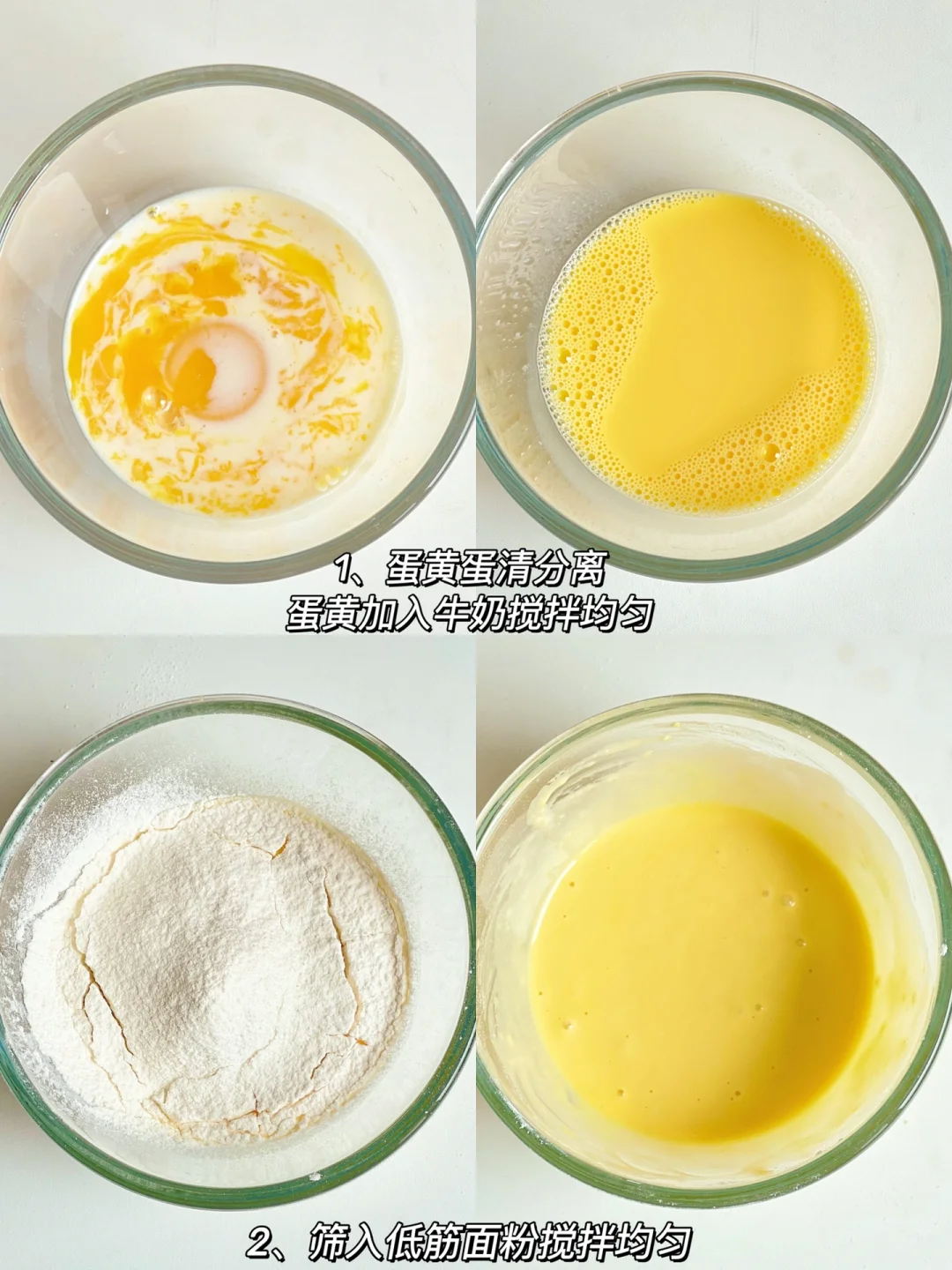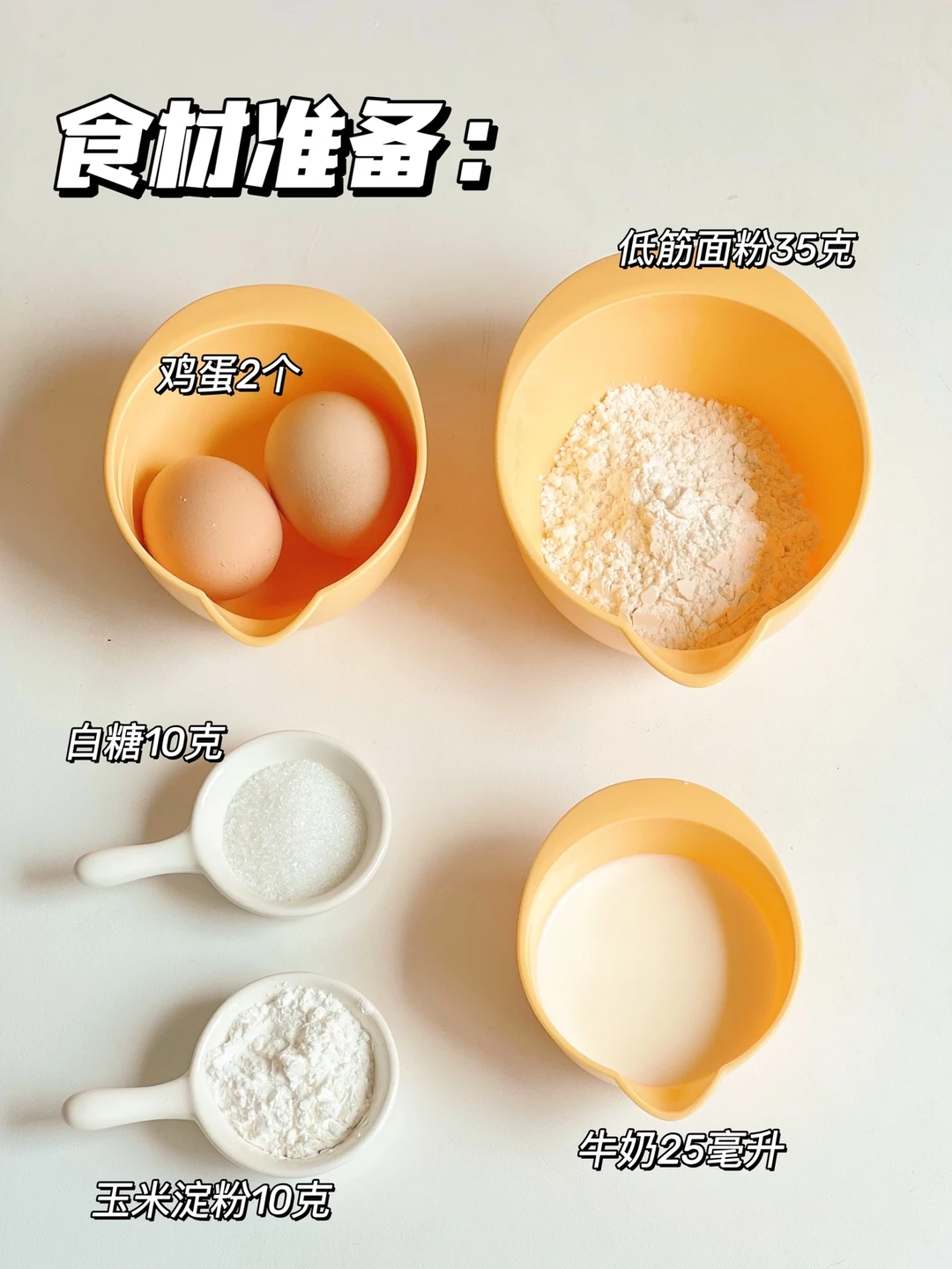 👩🏻🍳食材准备:鸡蛋2个,牛奶25毫升,40g低筋面粉,玉米淀粉10克,白糖10克(可以不放)