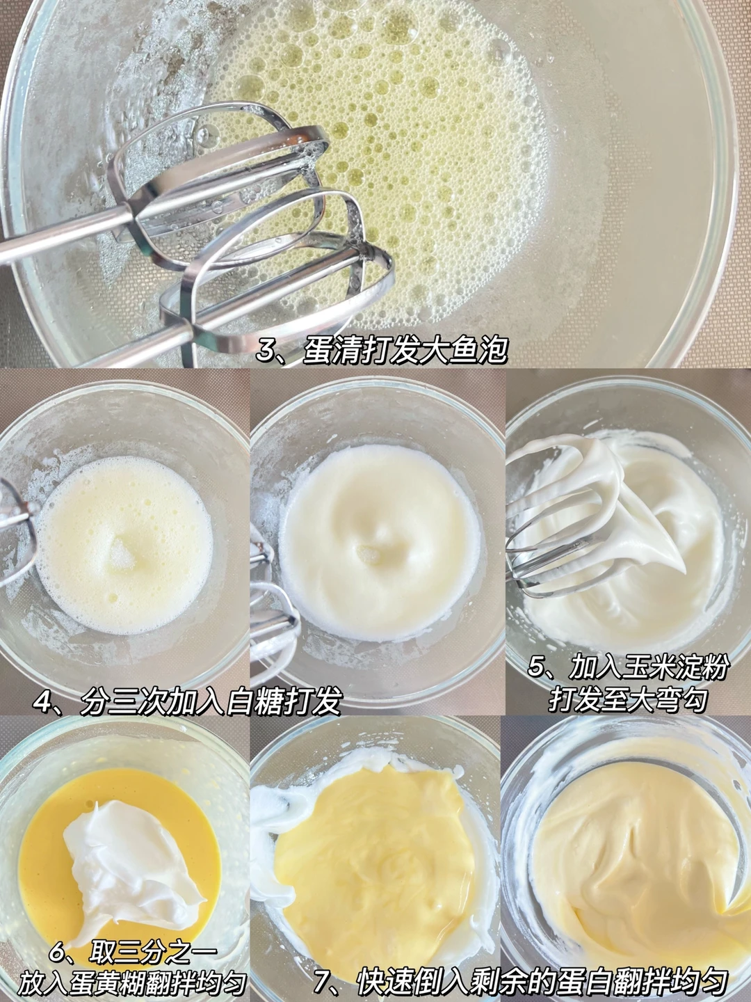 1、蛋清蛋黄分离到两个无油无水的碗中