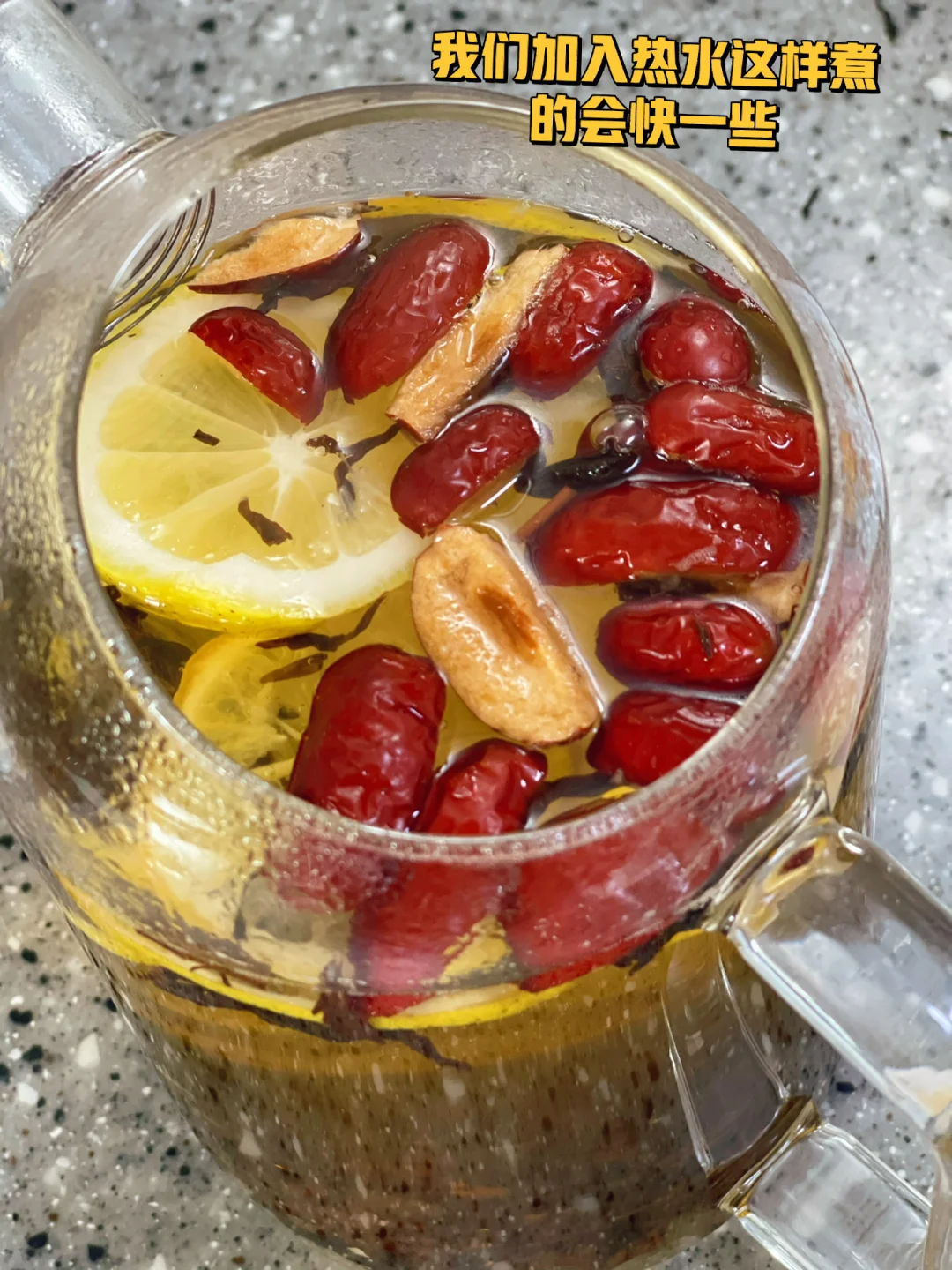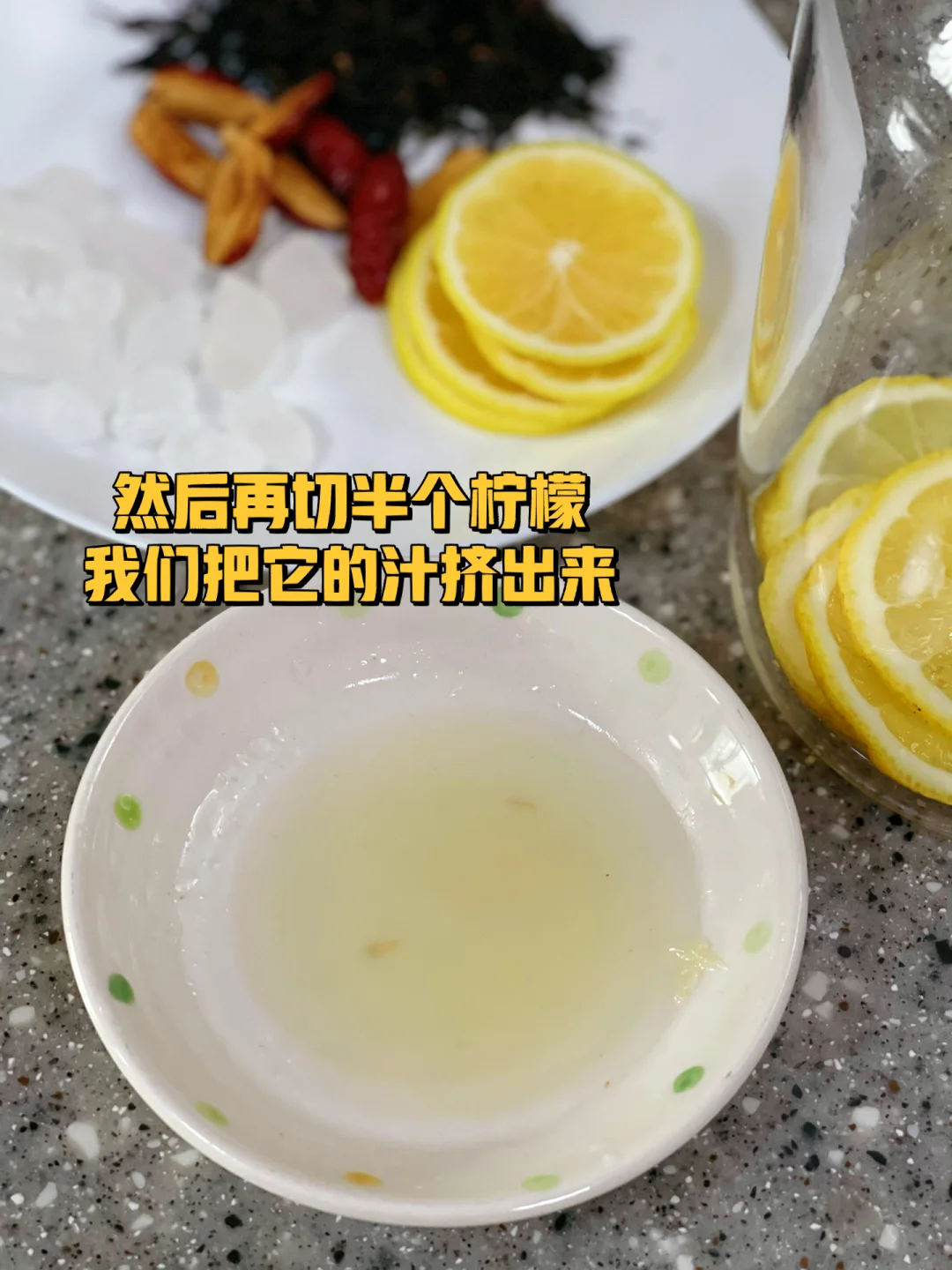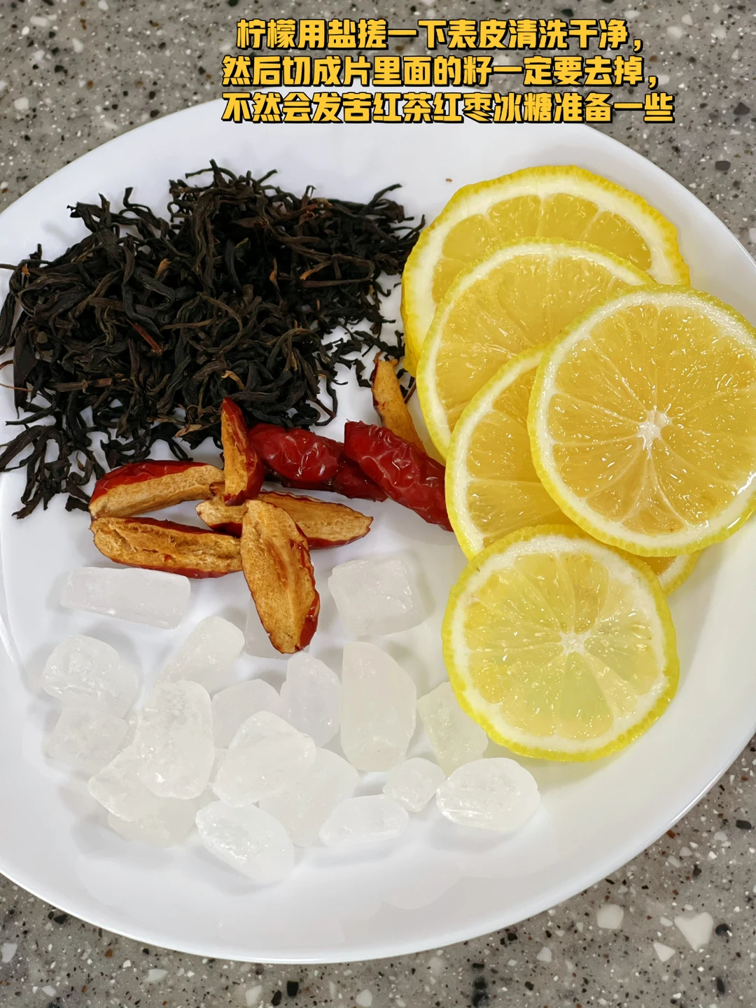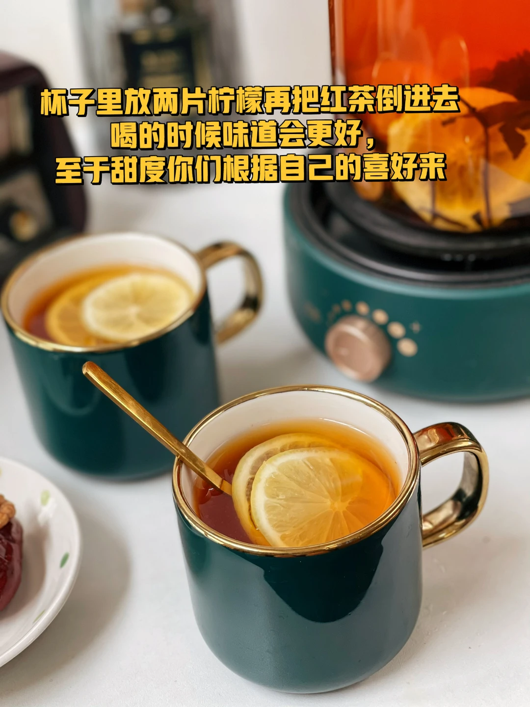 因为以前我对咖啡因过敏喝了咖啡之后胃会有点不舒服,所以每次和朋友去咖啡厅的时候只要有热柠檬红茶,我都会点这个 上次去超市看见柠檬有活动,买了好多做了一些柠檬酱冰箱里还剩下好几个又不想浪费,刚好那天下午吃甜点有点腻,于是就给自己做了一个好喝的热柠檬红茶,其实做法很简单 1. 柠檬用盐搓一下表皮清洗干净,然后切成片里面的籽一定要去掉,不然会发苦红茶红枣冰糖准备一些 2. 然后再切半个柠檬我们把它的汁挤出来 3. 所有的材料放进煮茶的壶里面 4.我们加入热水这样煮的会快一些 5. 煮开以后转小火继续煮五六分钟再焖十分钟左右,焖好的红茶颜色也看着更浓郁了,再把刚才挤好的柠檬汁倒进去 6. 杯子里放两片柠檬再把红茶倒进去喝的时候味道会更好,至于甜度,你们根据自己的喜好来