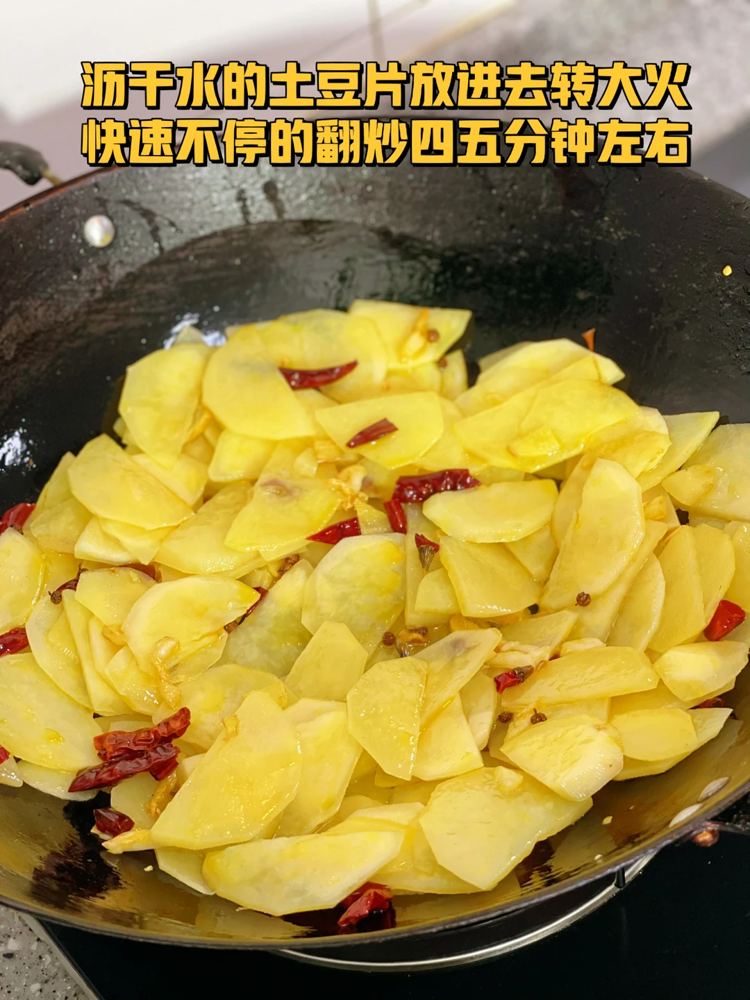 3. 沥干水的土豆片放进去转大火快速不停的翻炒四五分钟左右
