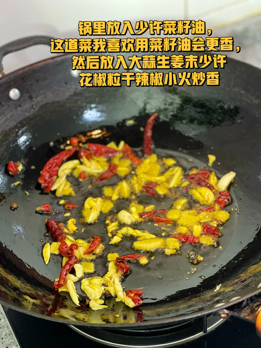 2. 锅里放入少许菜籽油,这道菜我喜欢用菜籽油会更香,然后放入大蒜生姜末少许花椒粒干辣椒小火炒香
