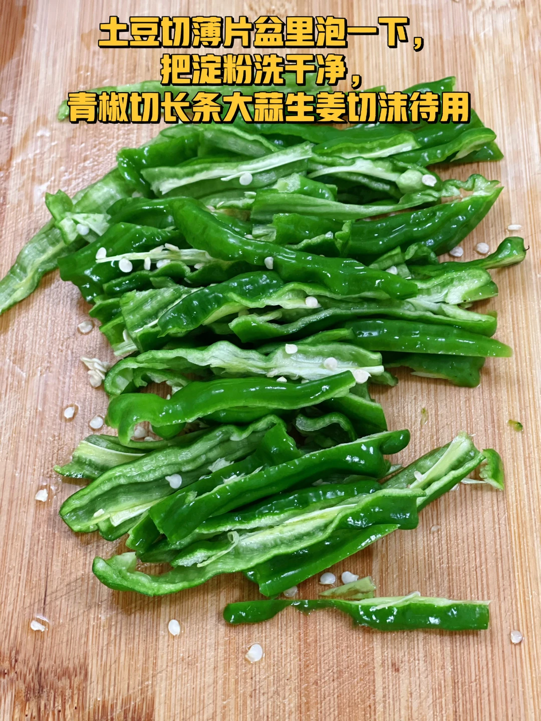 1. 土豆切薄片盆里泡一下,把淀粉洗干净,青椒切长条大蒜生姜切沫待用