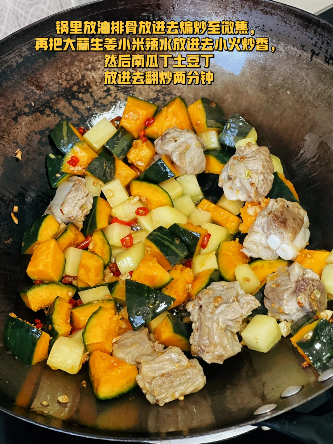5. 锅里放油排骨放进去煸炒至微焦,再把大蒜生姜小米辣水放进去小火炒香,然后南瓜丁土豆丁放进去翻炒两分钟