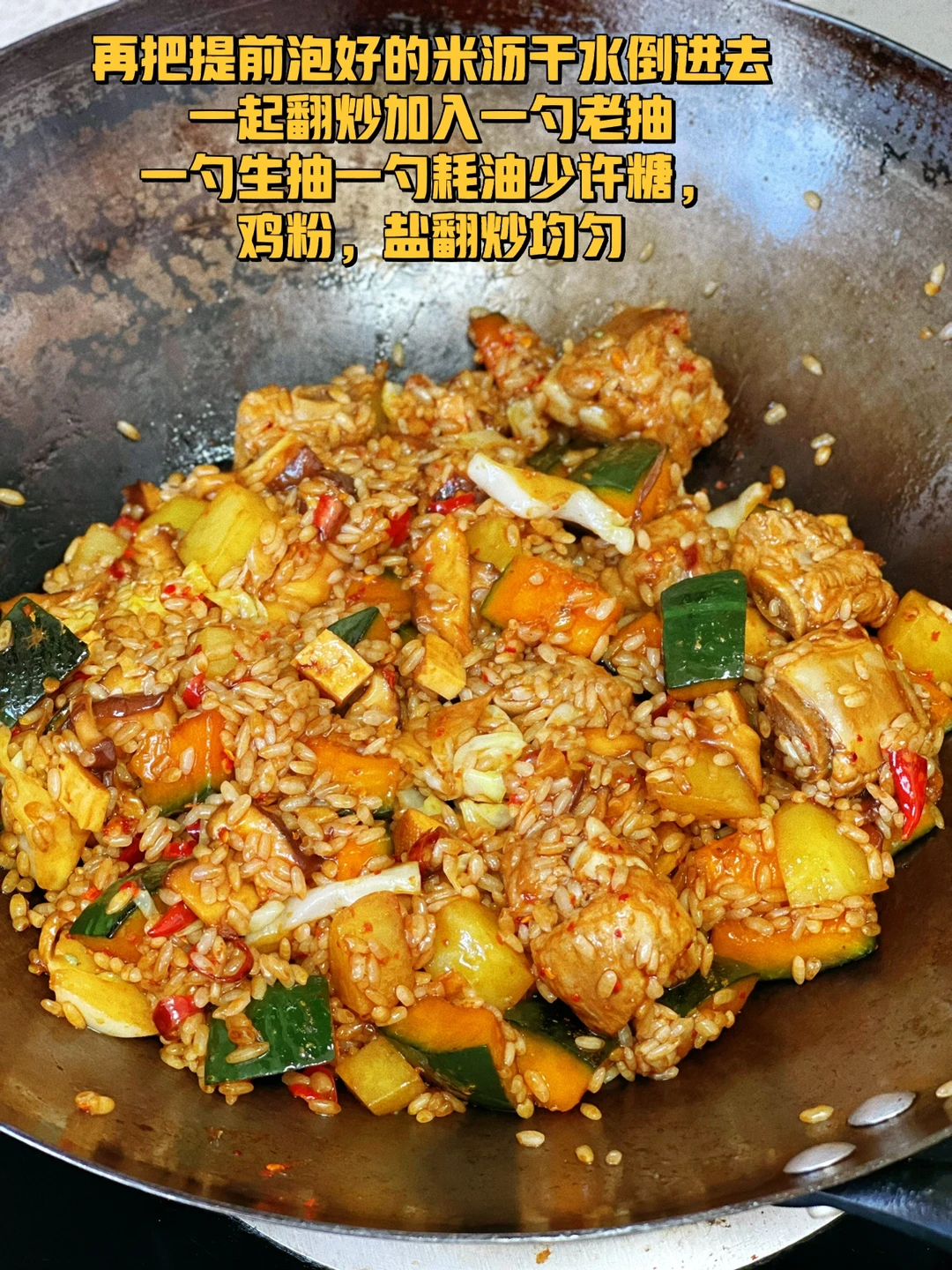 7. 再把提前泡好的米沥干水倒进去一起翻炒加入一勺老抽一勺生抽一勺耗油少许糖,鸡粉,盐翻炒均匀