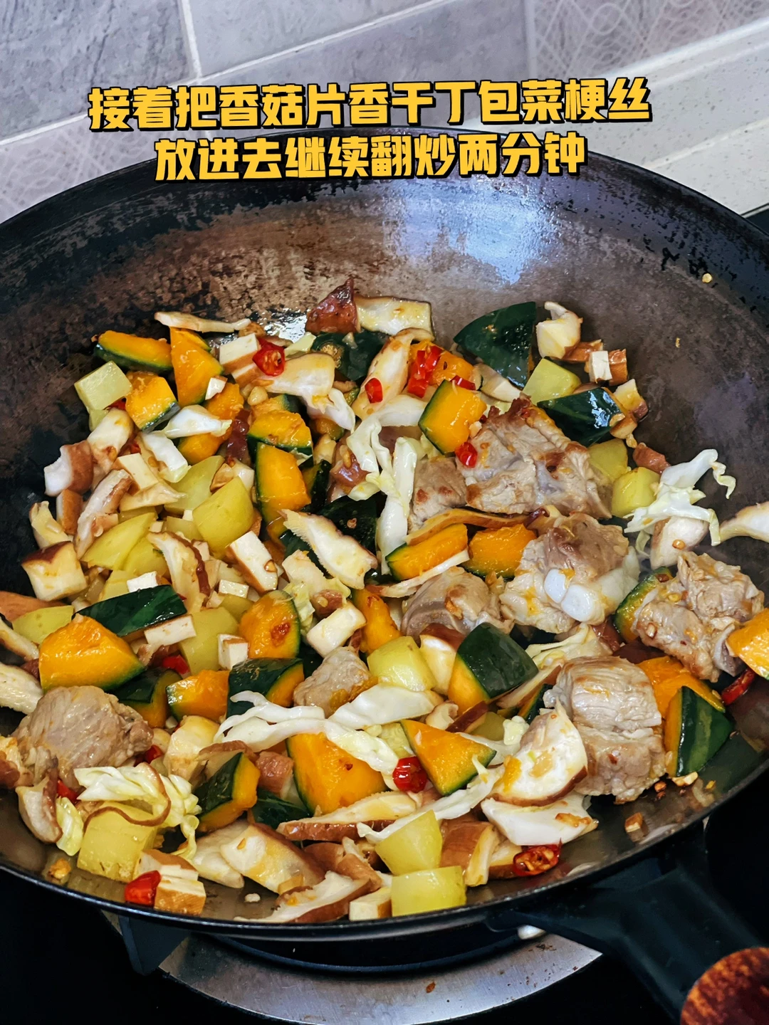 6. 接着把香菇片香干丁包菜梗丝放进去继续翻炒两分钟