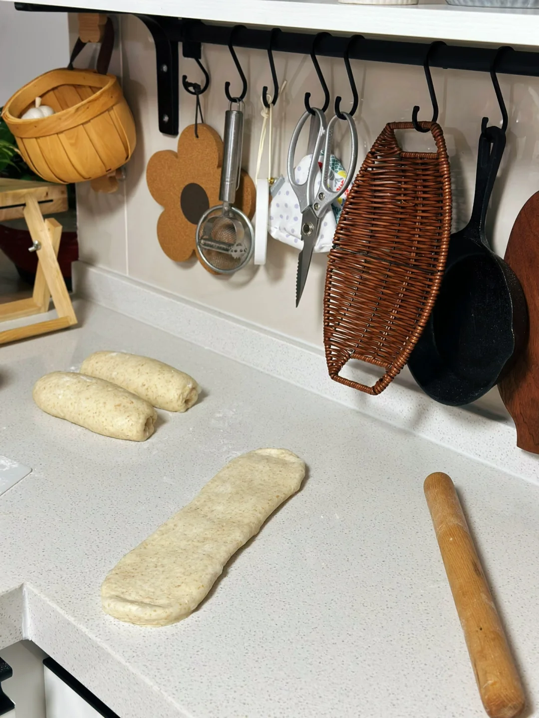 3.发酵好的面团,平均分成3份,排气滚圆,盖上保鲜膜常温松弛15分钟之后擀面杖擀开第一次卷,继续松弛10分钟左右开始第二次擀卷