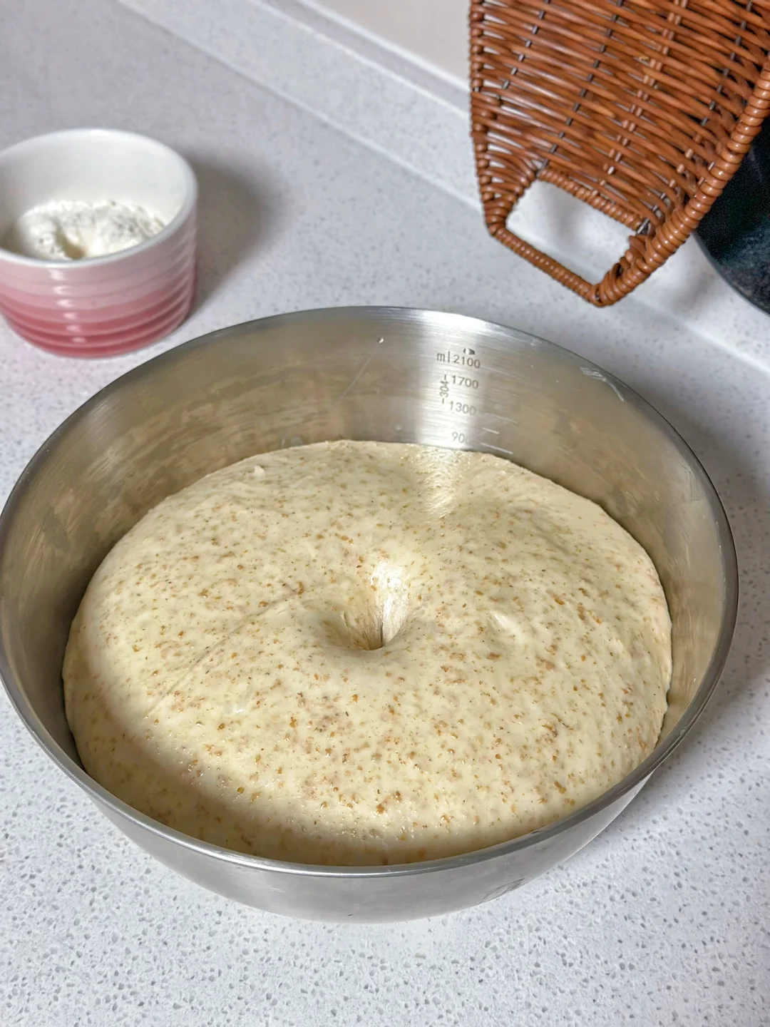 2.整理好面团,28 度湿度75%发酵至两倍大,发酵箱约40分钟,手戳洞不会马上回弹(夏天常温一个小时左右也可以)