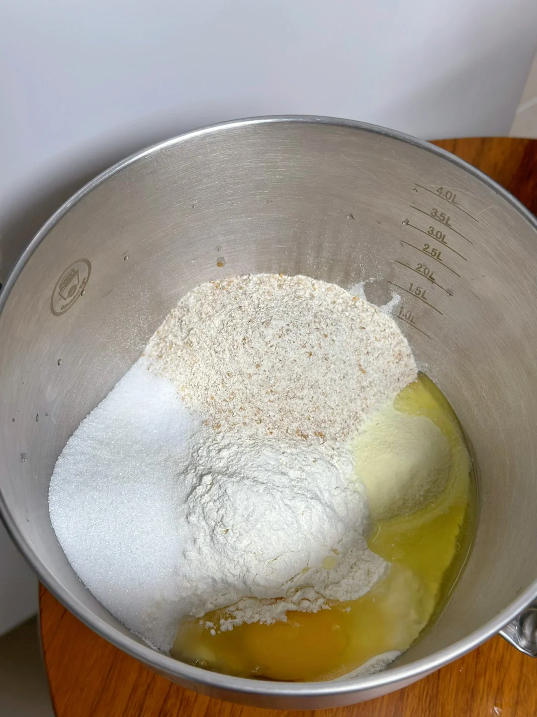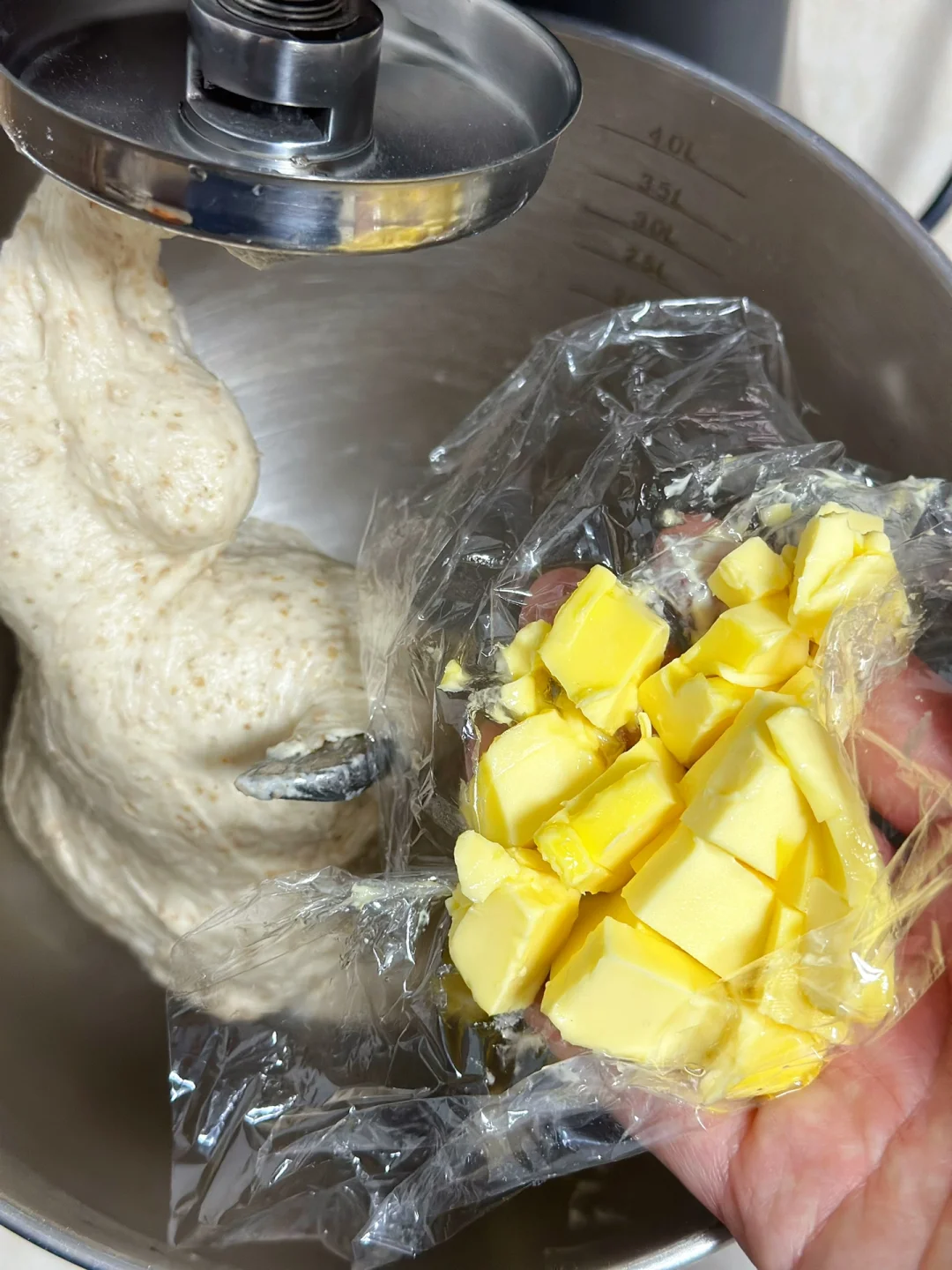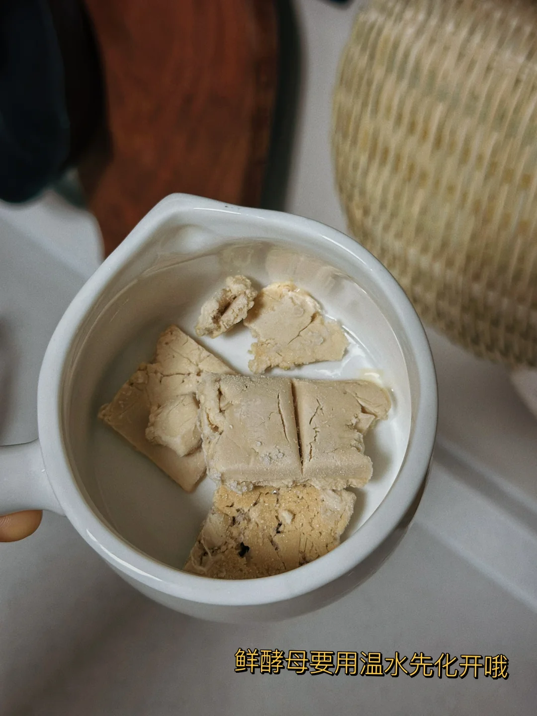 主面团材料: 500g 高筋面粉、60g白砂糖、40g黄油、 15g鲜酵母(或 5g耐高糖干酵母)、8g盐、50g全蛋液、15g奶粉、300g牛奶