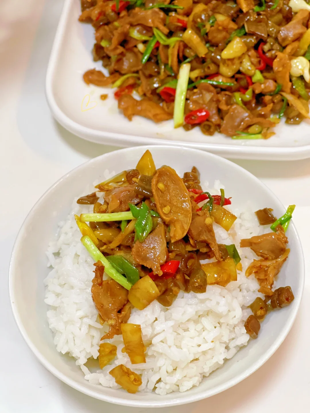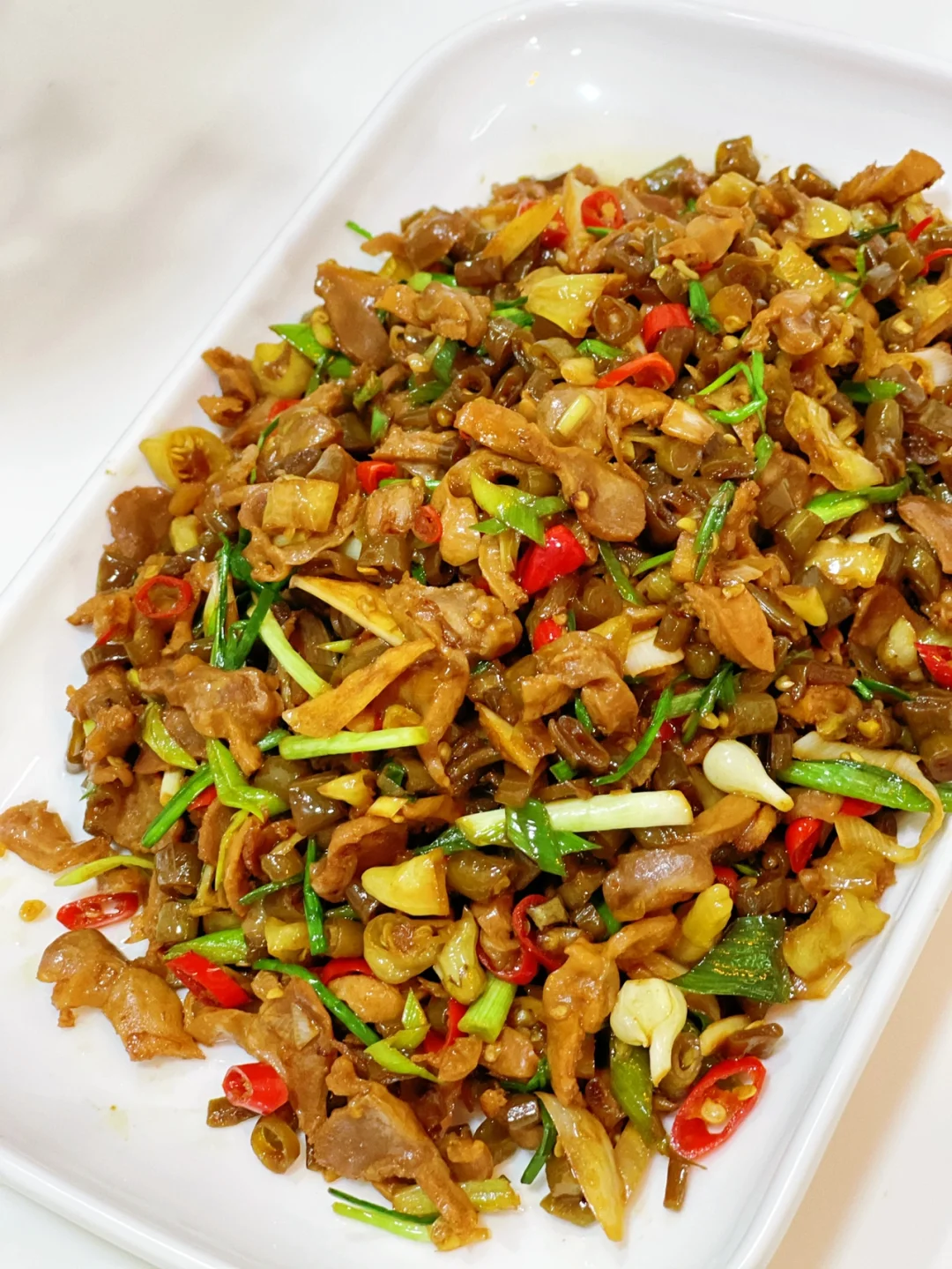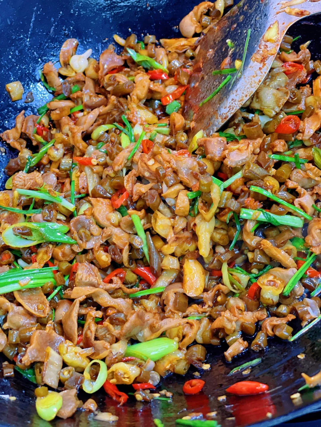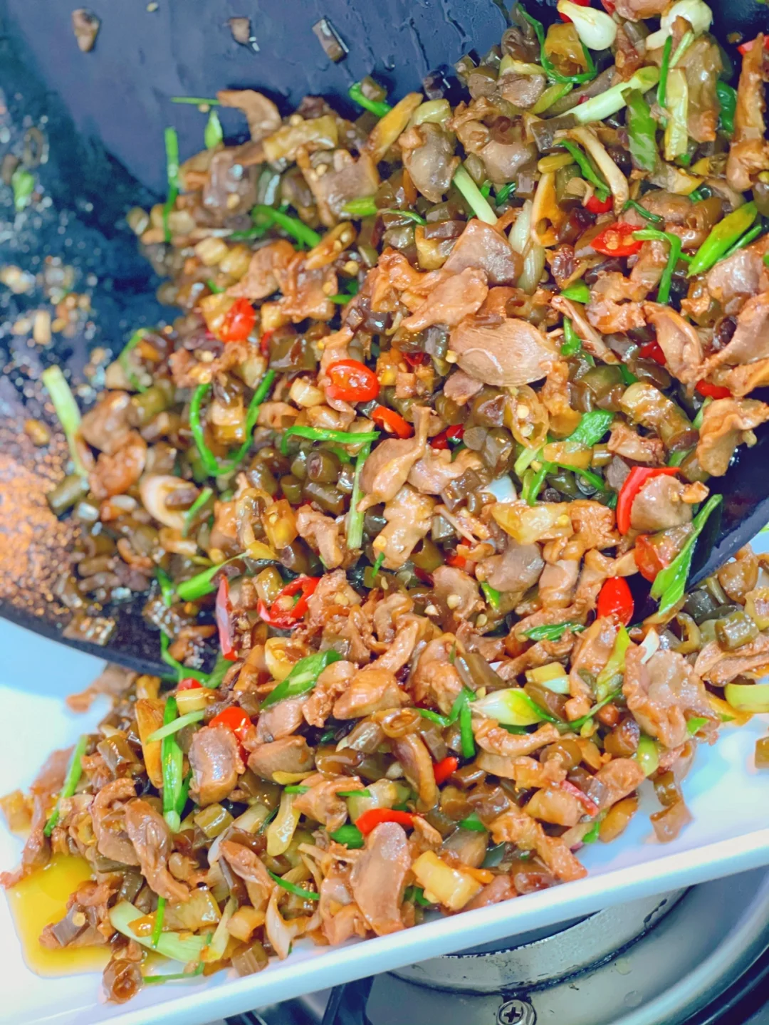 6.然后就是鸡胗啦丢进去快速翻炒,加入一勺料酒一勺生抽,四分之一勺老抽少许盐鸡粉糖炒匀,出锅之前撒葱花即可,吃不完的第二天早.上配稀饭不要太赞哦