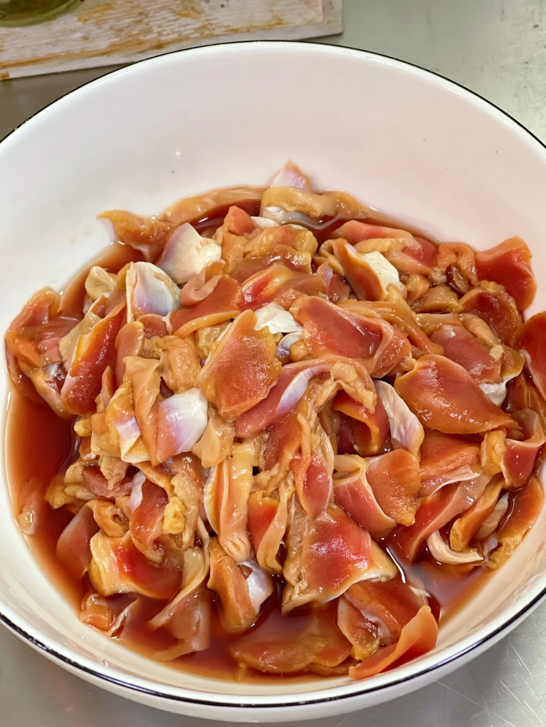 鸡胗切片之后加入一勺白酒用手多抓几下这样很好的去腥效果,然后用水多清洗几遍沥干水