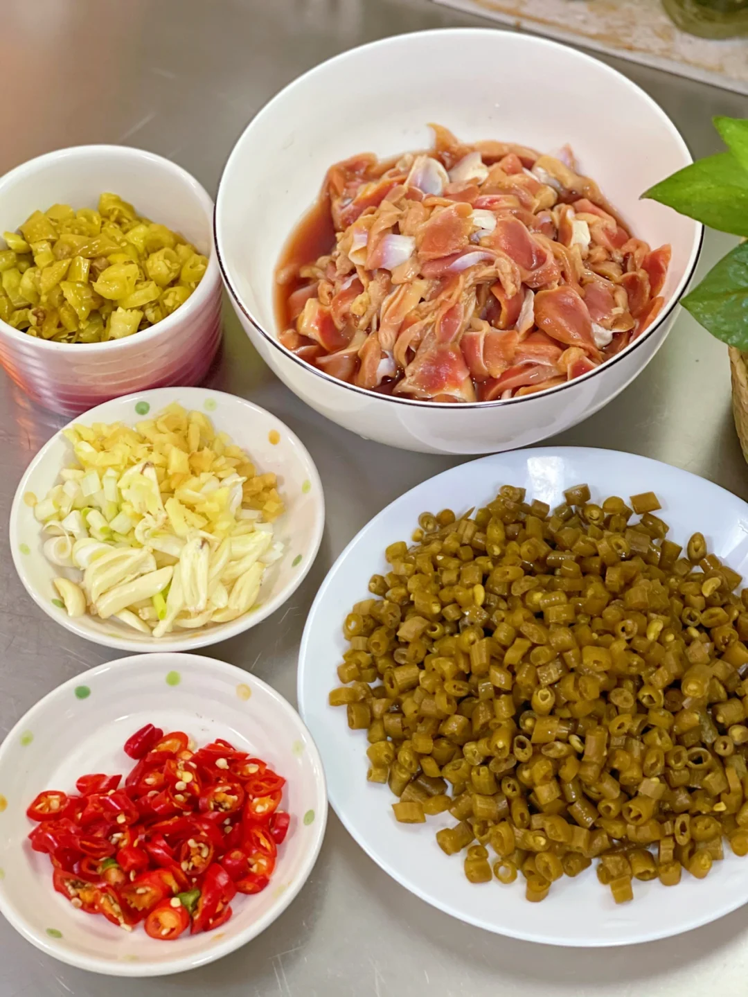 2.大蒜生姜切末,小米辣泡椒切小段,酸豆角是自己腌制的切小丁