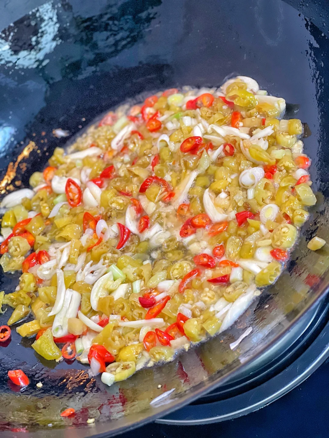 4.重新洗锅上油小火爆香大蒜生姜沫小米辣泡椒段