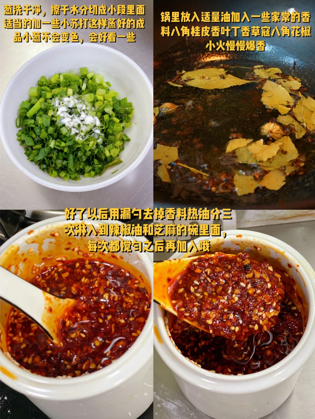 3. 好了以后用漏勺去掉香料热油分三次淋入到辣椒油和芝麻的碗里面,每次都搅匀之后再加入哦