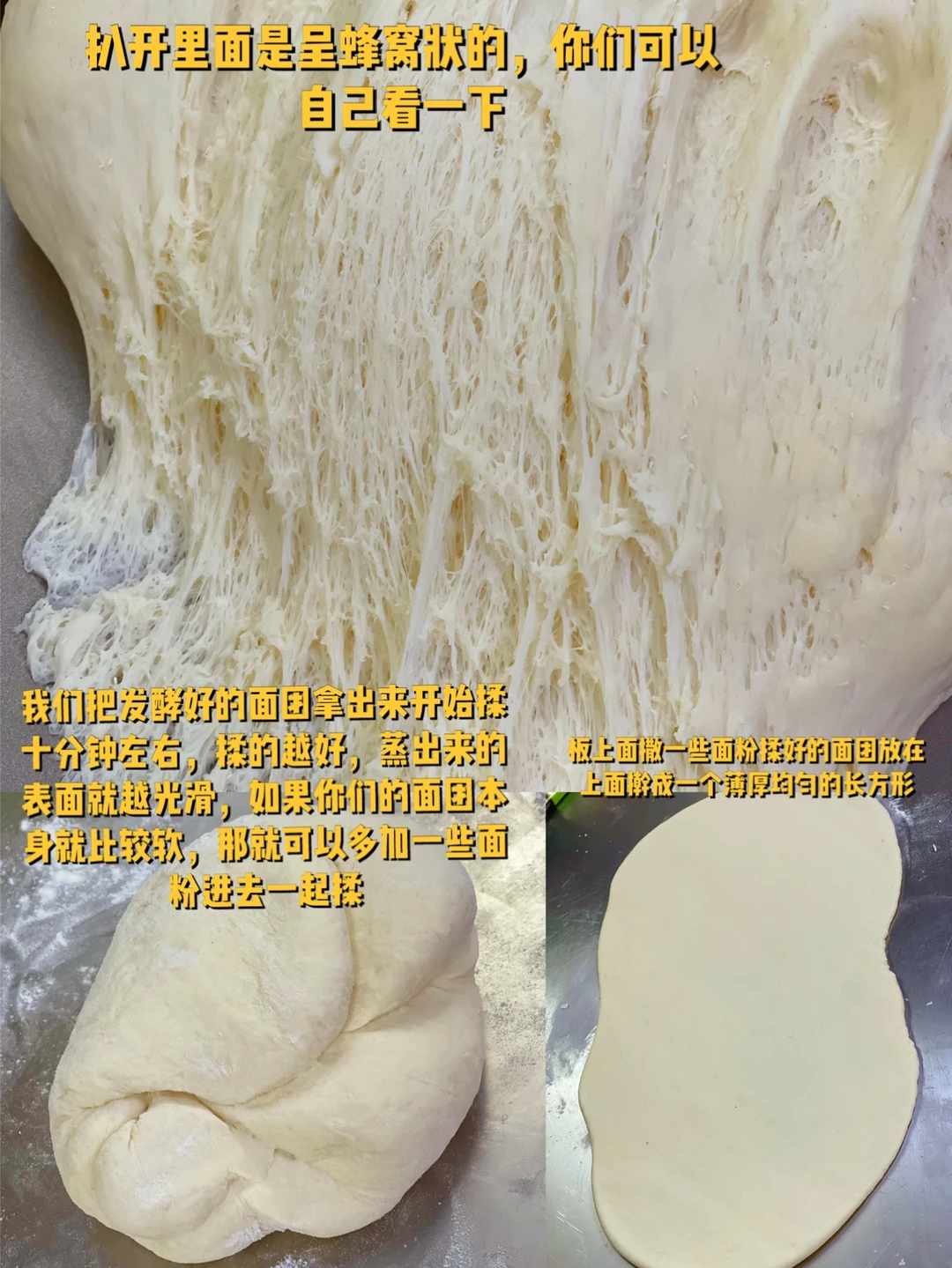 8. 我们把发酵好的面团拿出来开始揉十分钟左右,揉的越好,蒸出来的表面就越光滑,如果你们的面团本身就比较软,那就可以多加一些面粉进去一起揉