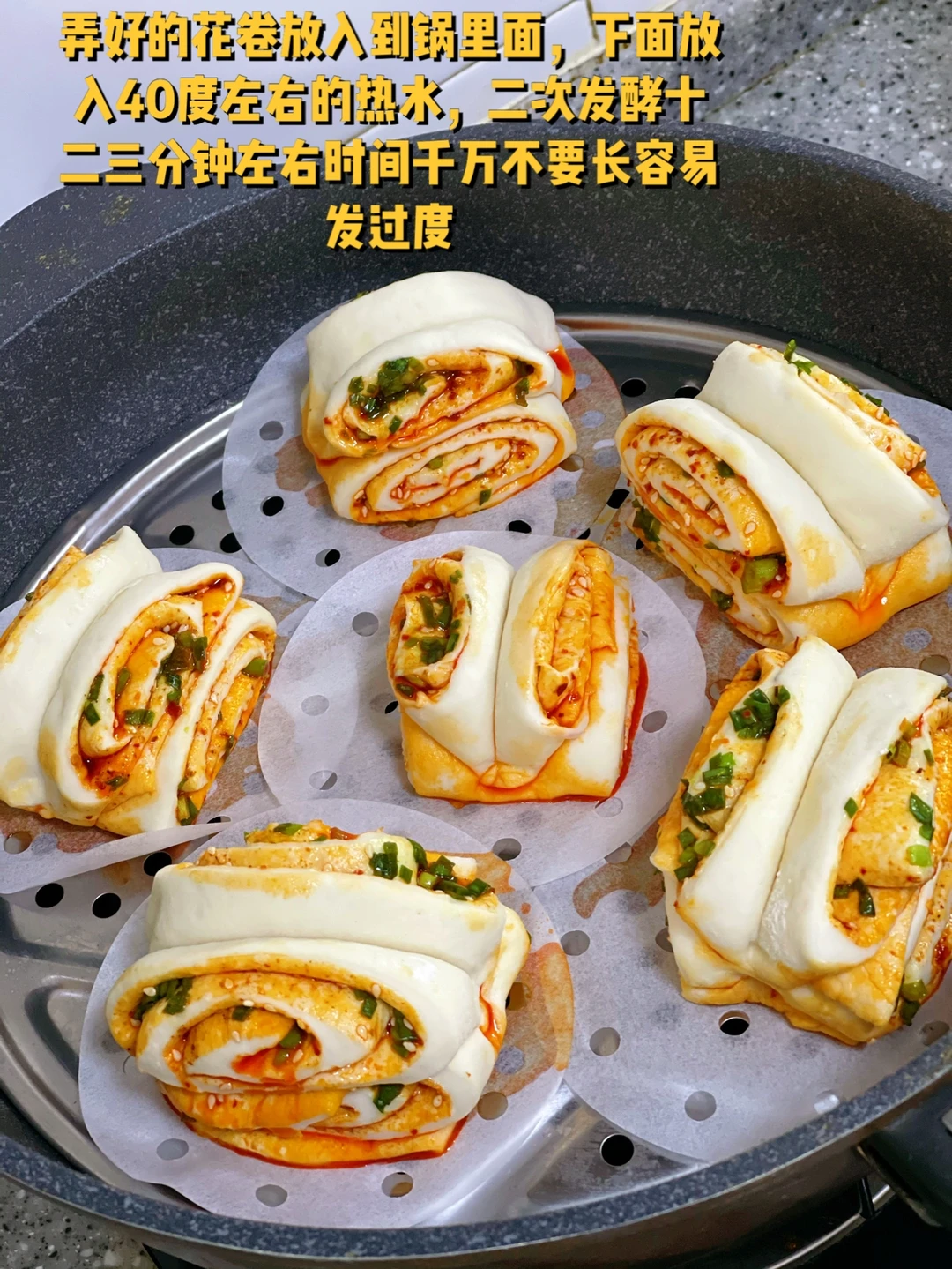 14. 弄好的花卷放入到锅里面,下面放入40度左右的热水,二次发酵十二三分钟左右时间千万不要长容易发过度