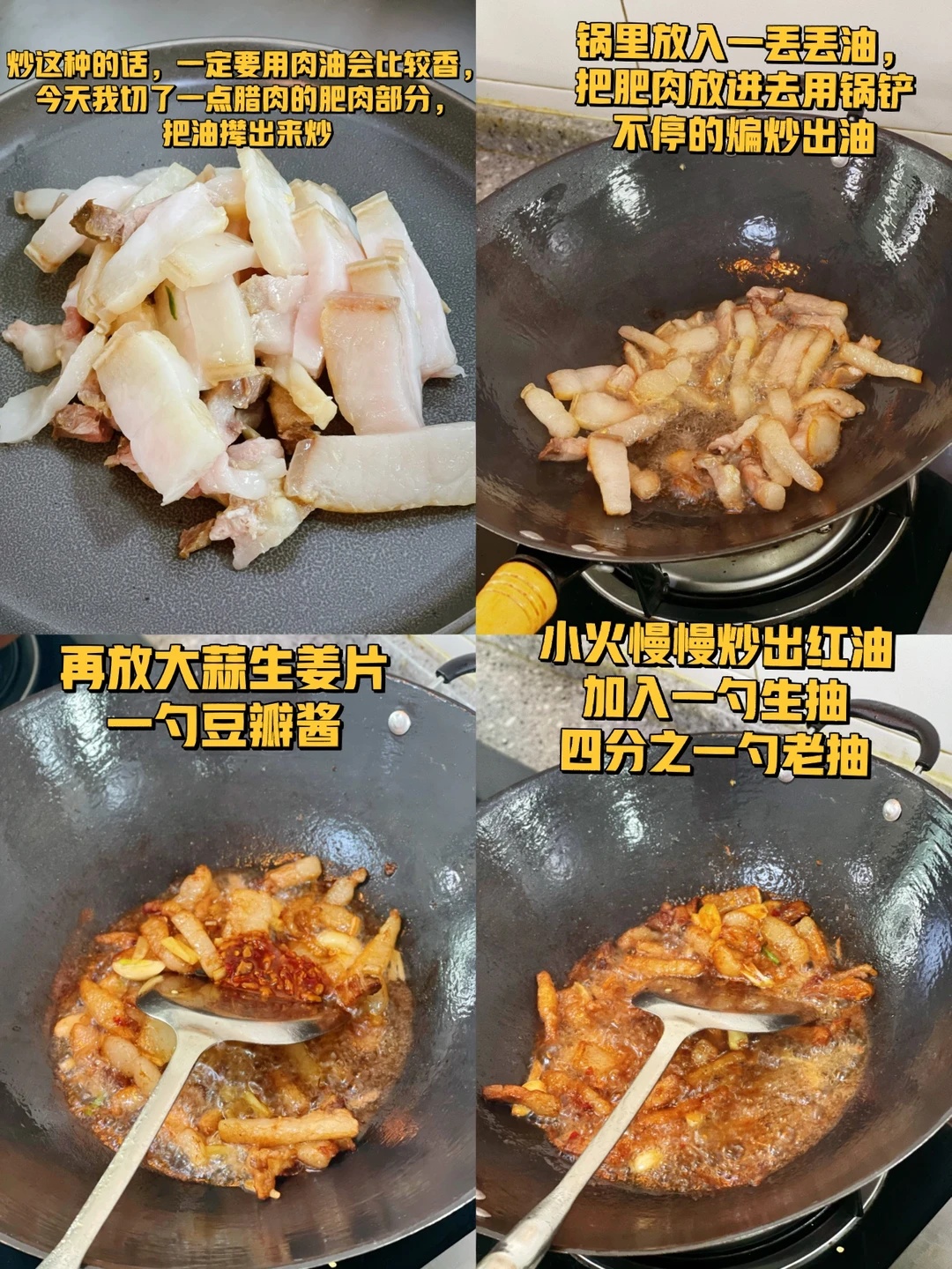 4. 炒这种的话,一定要用肉油会比较香,今天我切了一点腊肉的肥肉部分,把油撵出来炒